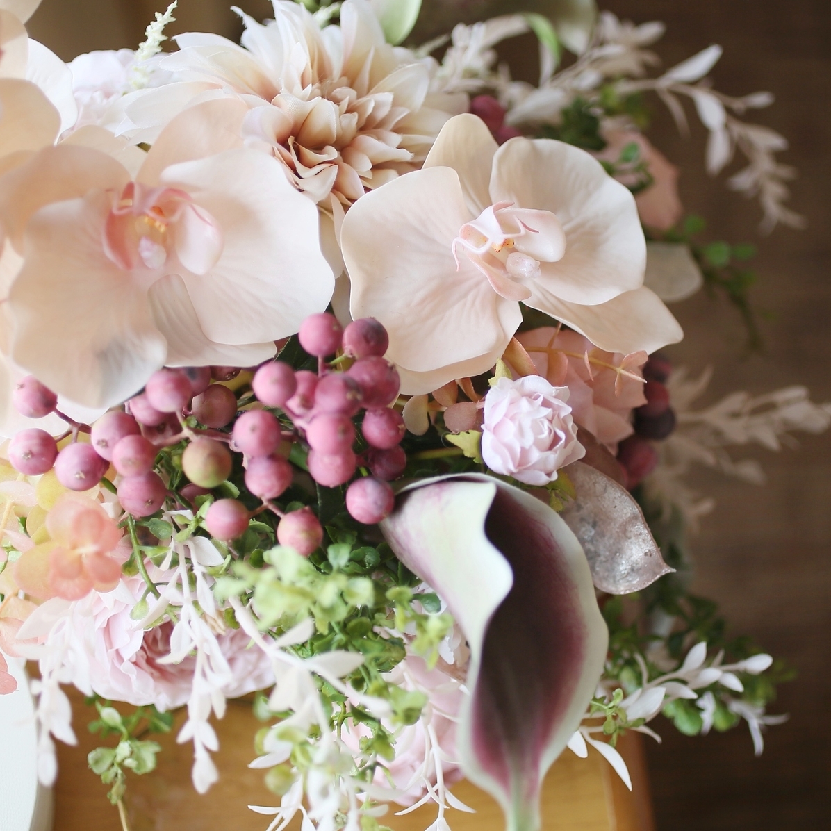 コンセプトは秋らしさのあるドライフラワーと生花で、ニュアンスカラー、ベージュ、ブラウンをベースにポイントでボルドーやテラコッタの色味を入れてもらいました。