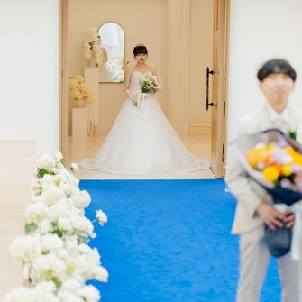 見学時に実際に扉を開く体験をさせていただいた際、真っ白な空間と青いバージンロードが目に飛び込み、あまりの美しさに涙が出て、今でも覚えているくらい心を打たれました。