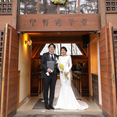 緑溢れる自然、温かい雰囲気や木の匂い、ハープとオルガンの演奏も素敵です。またライスシャワーも軽井沢高原教会ならではの演出の一つです!
