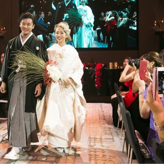 披露宴はそんなパーティに合わせた装花デザインとプロジェクションマッピング等の演出にこだわり、私たちが審査員となるベストドレッサー賞を行ったり、プロフィールムービーで映画のコンテンツをパロディしたり、レッドカーペットやフォトブースを作ったりしてテーマを統一していきました♡