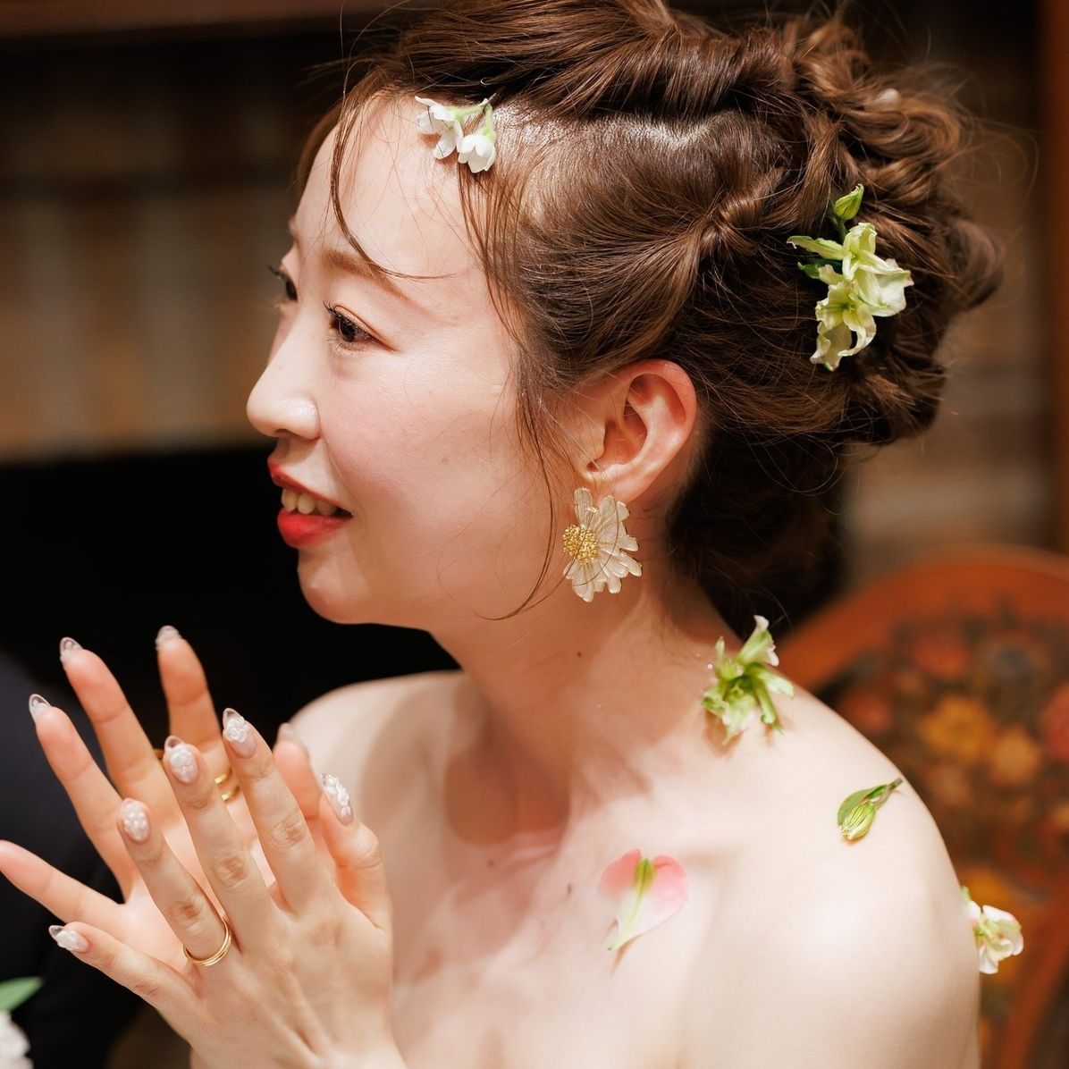 お花メインのヘアメイクにすることを決めてからネイルもお花にしようと考えていて、普通じゃつまらないなと悩んでSNSを漁ってクリアベースに辿り着きました!