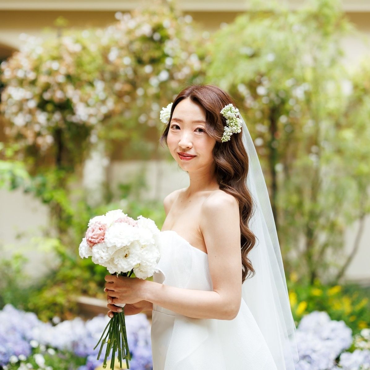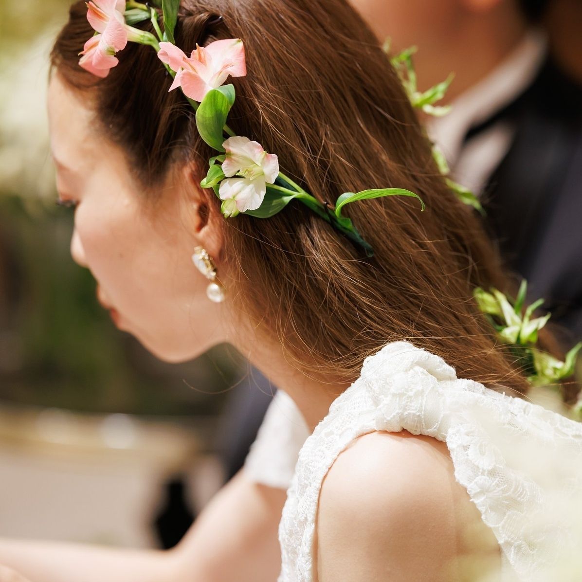 挙式はダウンヘアのこめかみに種類の違う白い小さなお花をアシンメトリーに。披露宴入場ではアップヘアに白い蕾をメインに散らして。