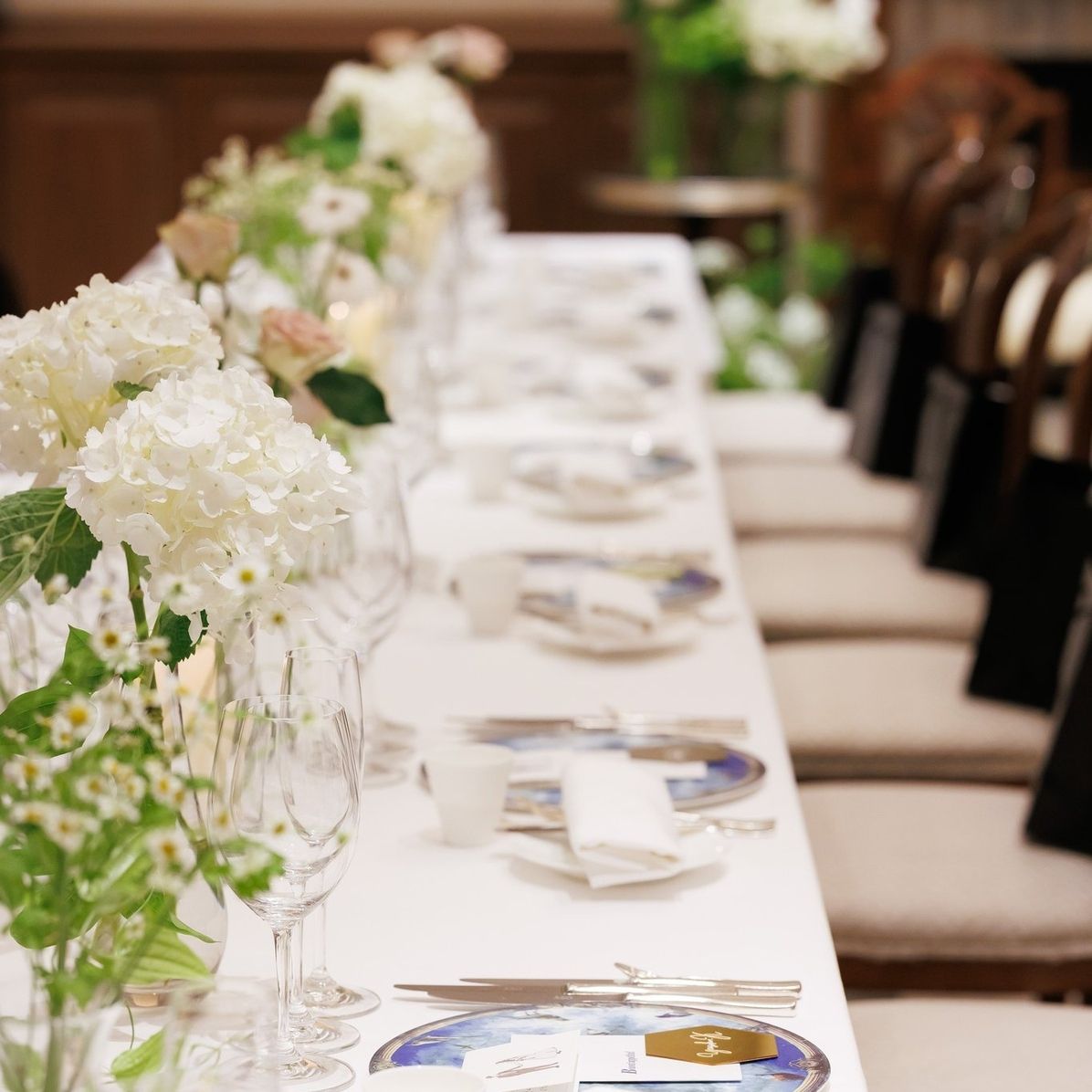 リストランテASOの雰囲気をそのまま生かせるように色味は白グリーンメインでクリーンなものにしています。新郎が雰囲気に置いてけぼりにならないようにという思いも強くありました。