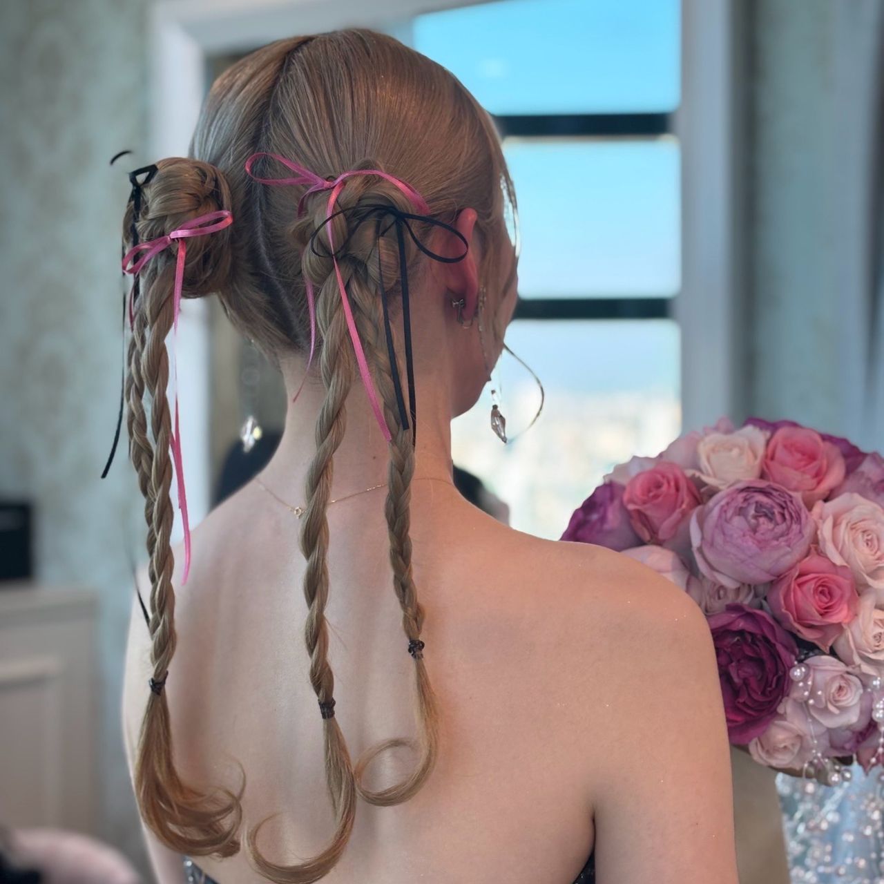 ヘアは、ウェディングドレスの時はシニヨンにし、カラードレスの時はドレスがブラックだったので「韓国可愛い」をテーマに、ツインテール編み下ろしにしました。ブラックドレスが映える金髪にしたのも、こだわりです!
