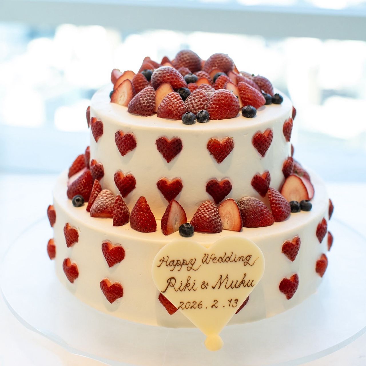 ハートのイチゴをたくさん飾った2段ケーキです。