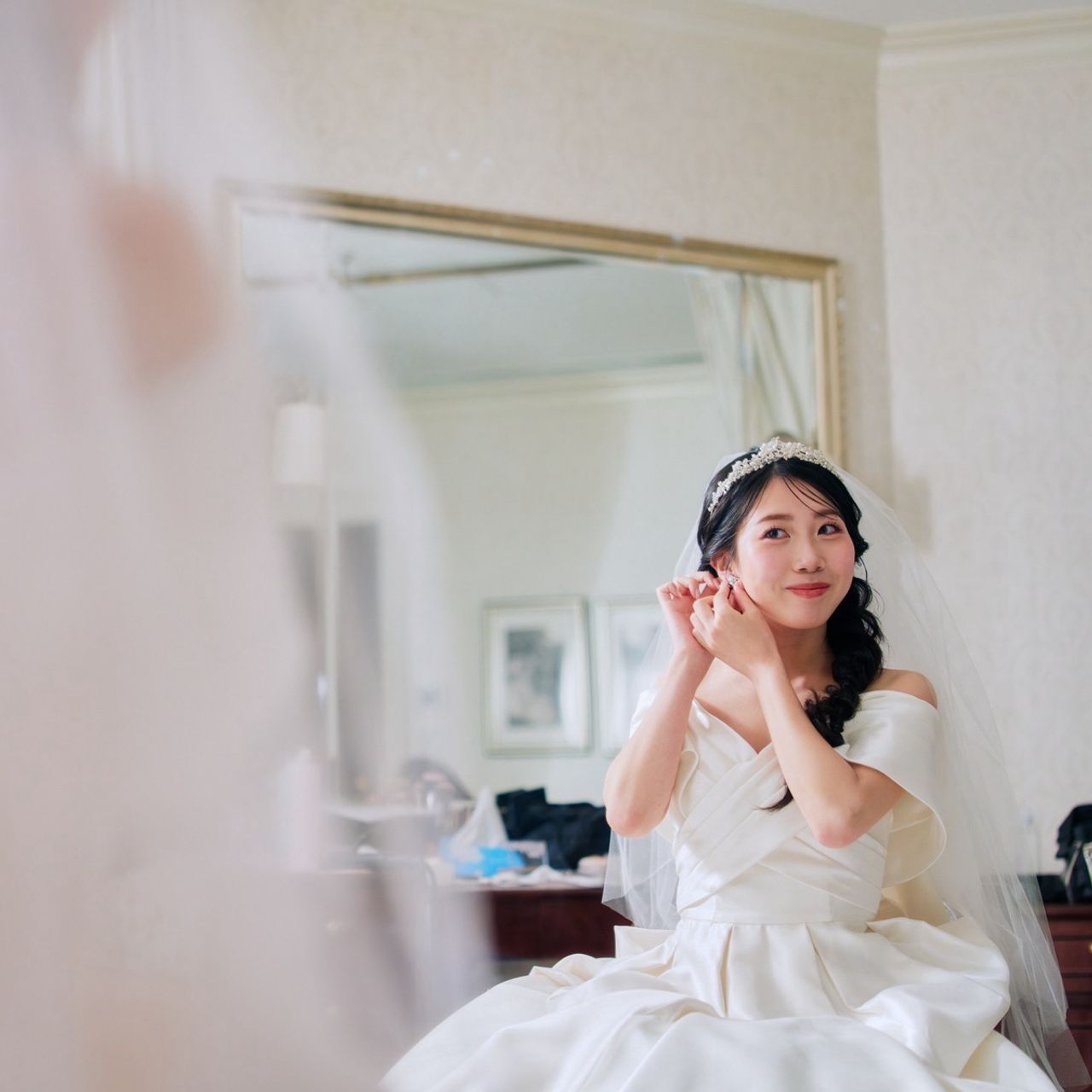 挙式では小さめのイヤリング、披露宴では大きめの星のような可愛いイヤリングをつけました。