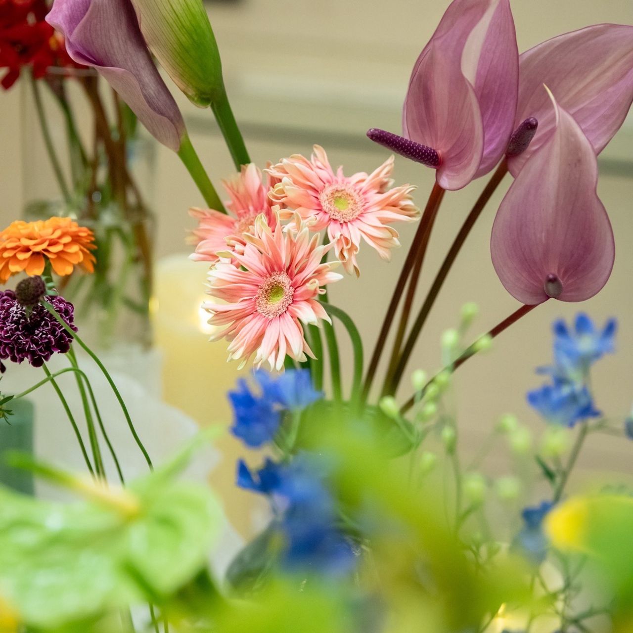 式場提携のフローリストたきとうさんに、青とオレンジ、水色と黄色など、具体的な色の組み合わせを伝えながらイメージを共有しました。