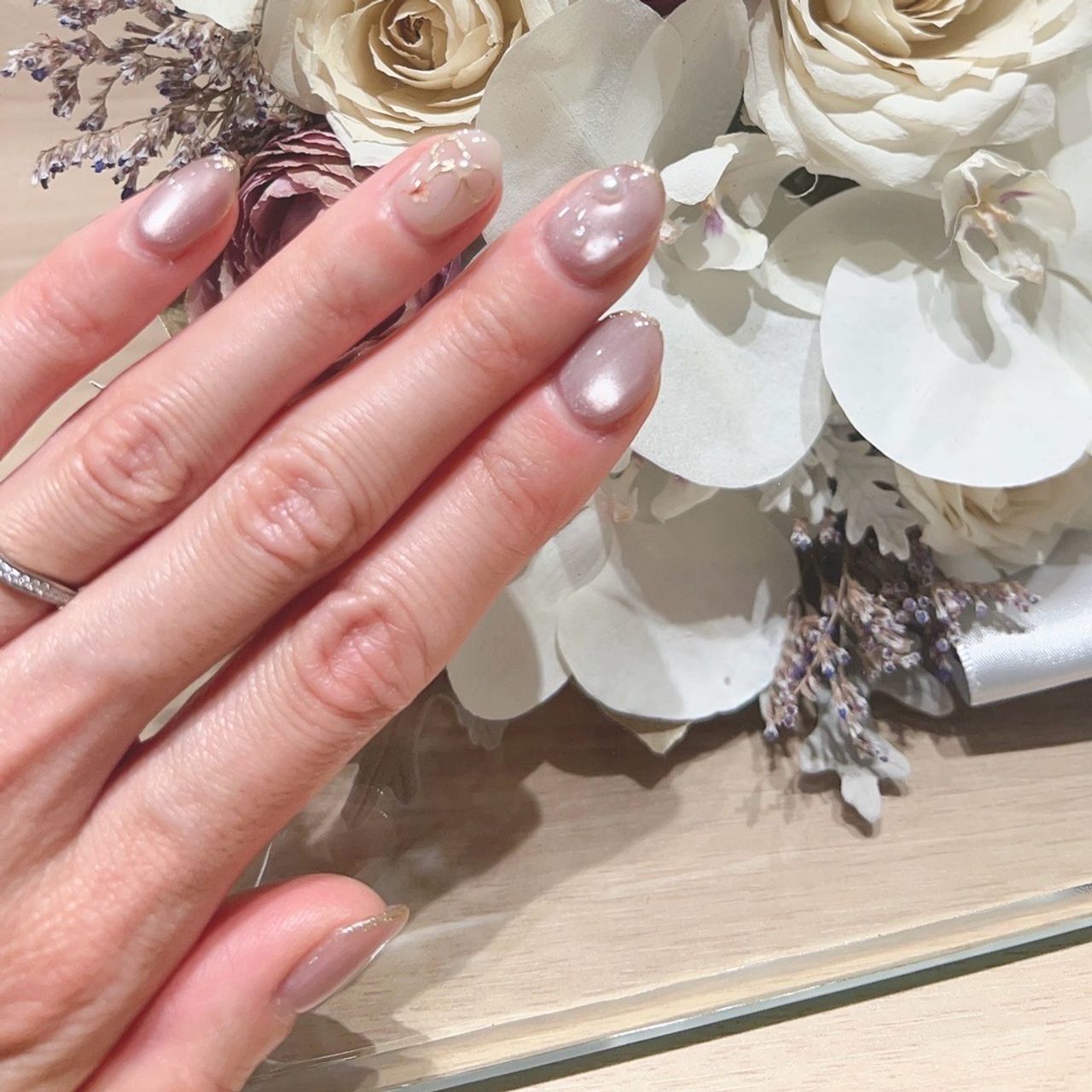 ピンクベージュのマグネットをベースに、爪先をキラキラさせました。指によって小ぶりのパールや、華奢なリボンのイラストを施しています。初めてのハンドネイルでした♡