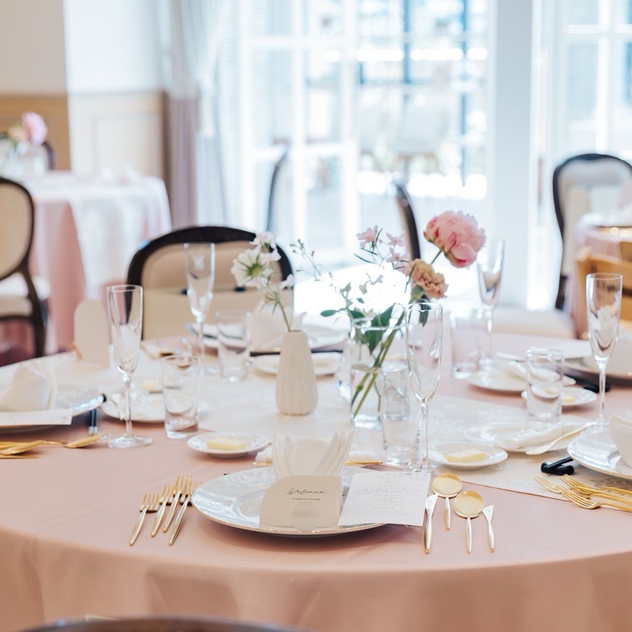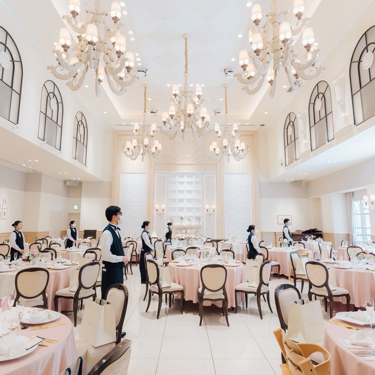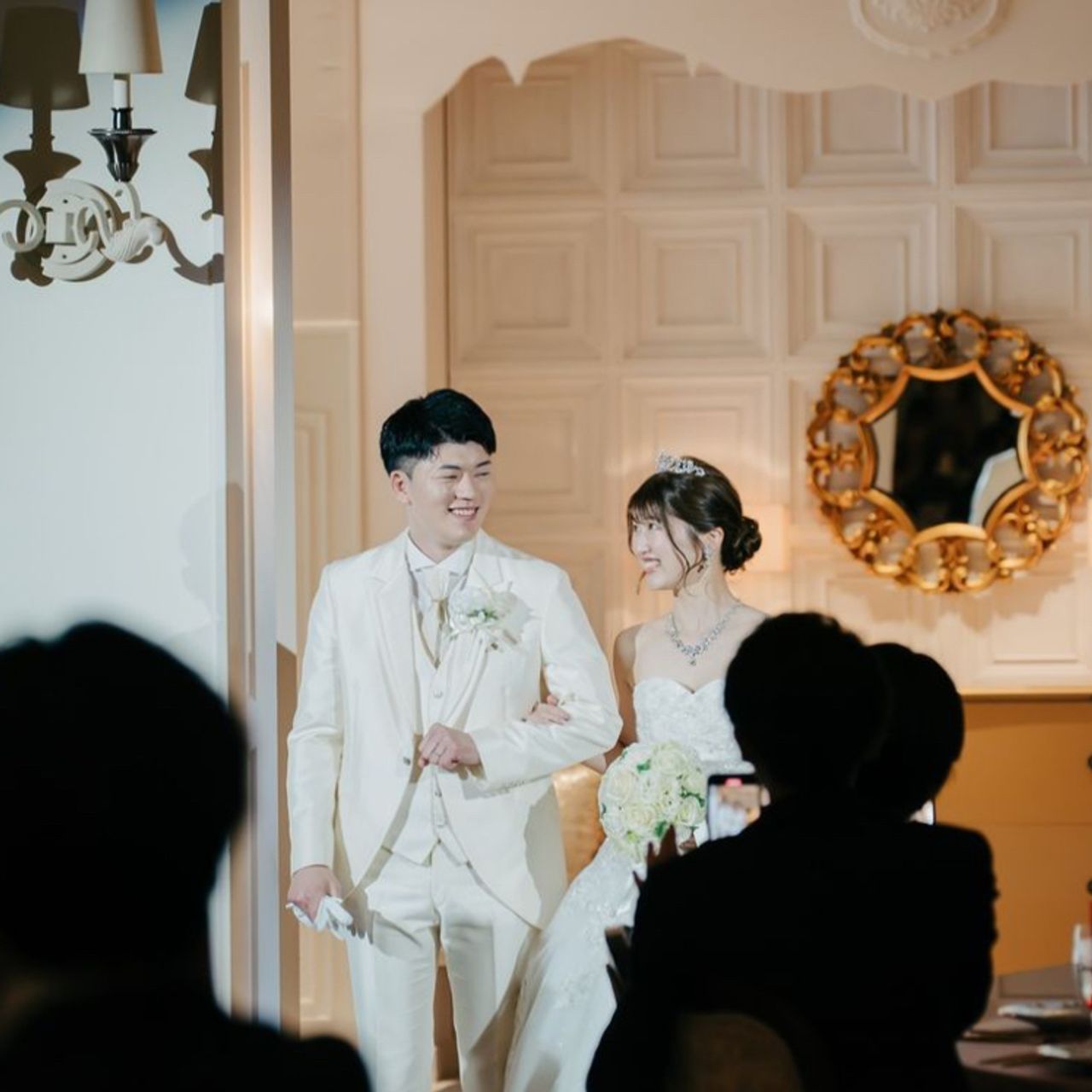 シャンデリアや窓の雰囲気、壁や床の色味・素材に惹かれました。高砂からゲストが見やすい並びも気に入っています。