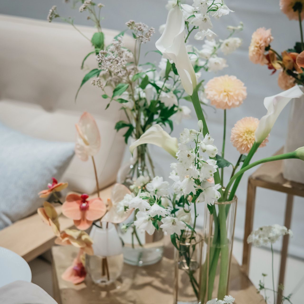 装花は、プランツコレクションの横田さんにお願いしました。やわらかい雰囲気が好きなので、あまりパキッとした色は入れず、白をメインに薄ピンクやオレンジ、グリーンなど淡い色を中心にお任せしました。