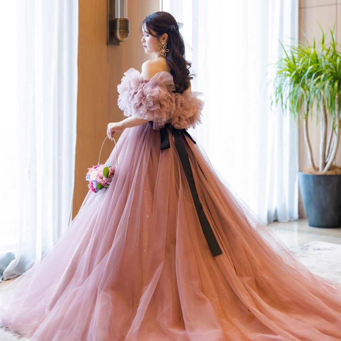 柔らかみのあるくすみピンクに胸元のふわふわに腰の黒リボン、控えめだけど存在感のあるスパンコールのこれら全てが好みでした。