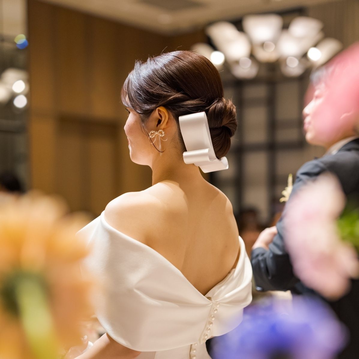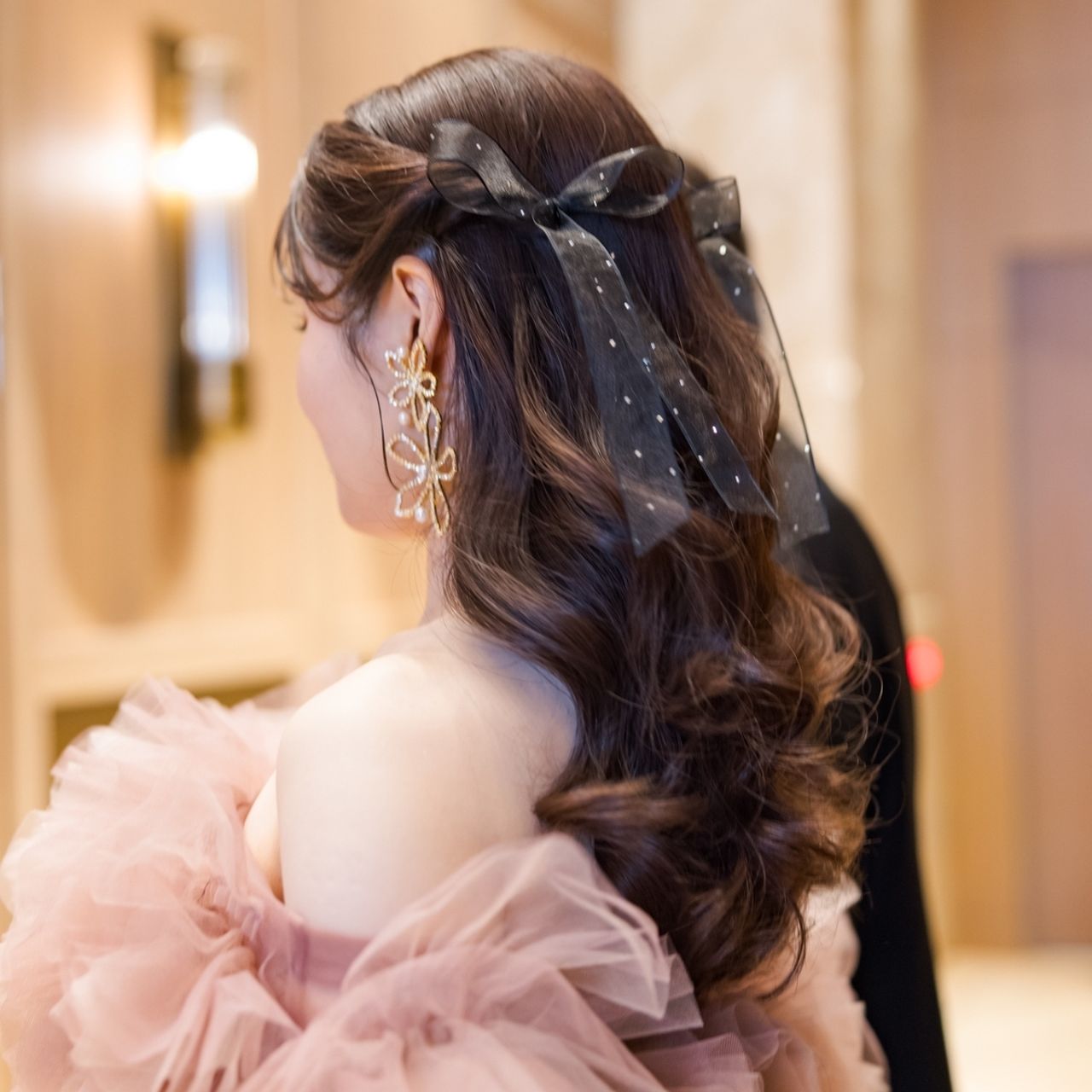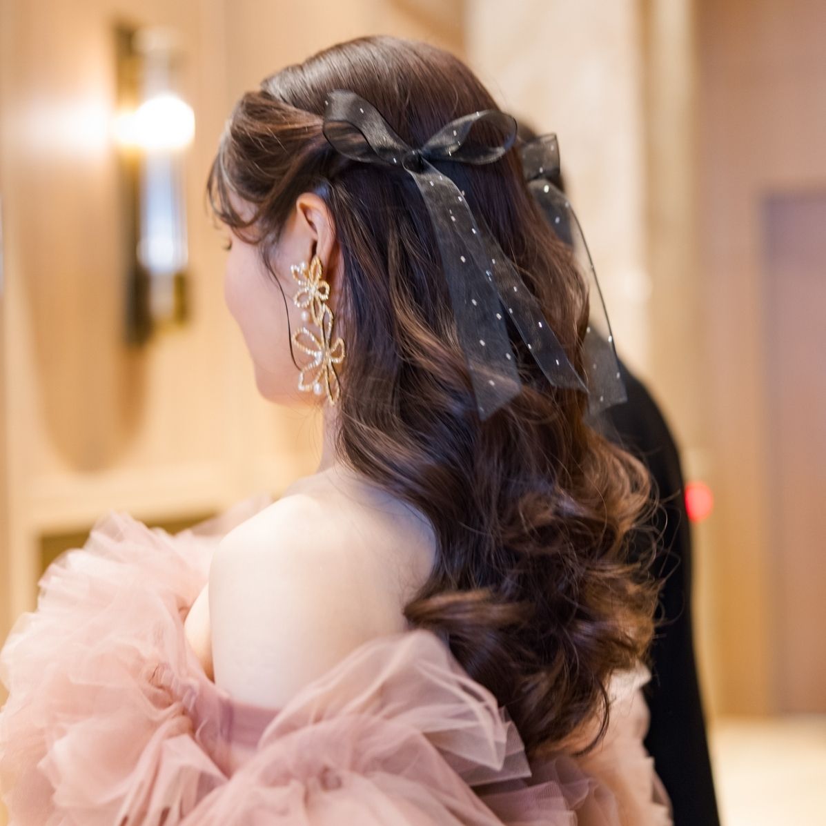 お色直しはハーフアップに合わせて、シアー素材のキラキラの黒リボンを使いました。