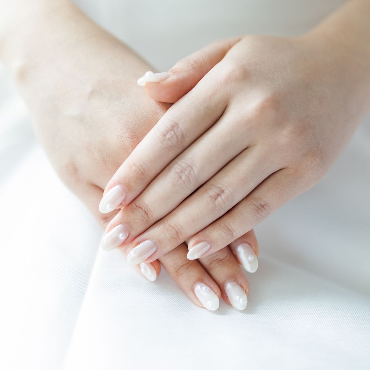 ウェディングドレスのモチーフに合わせホワイトベースにパールを付けてもらいました。