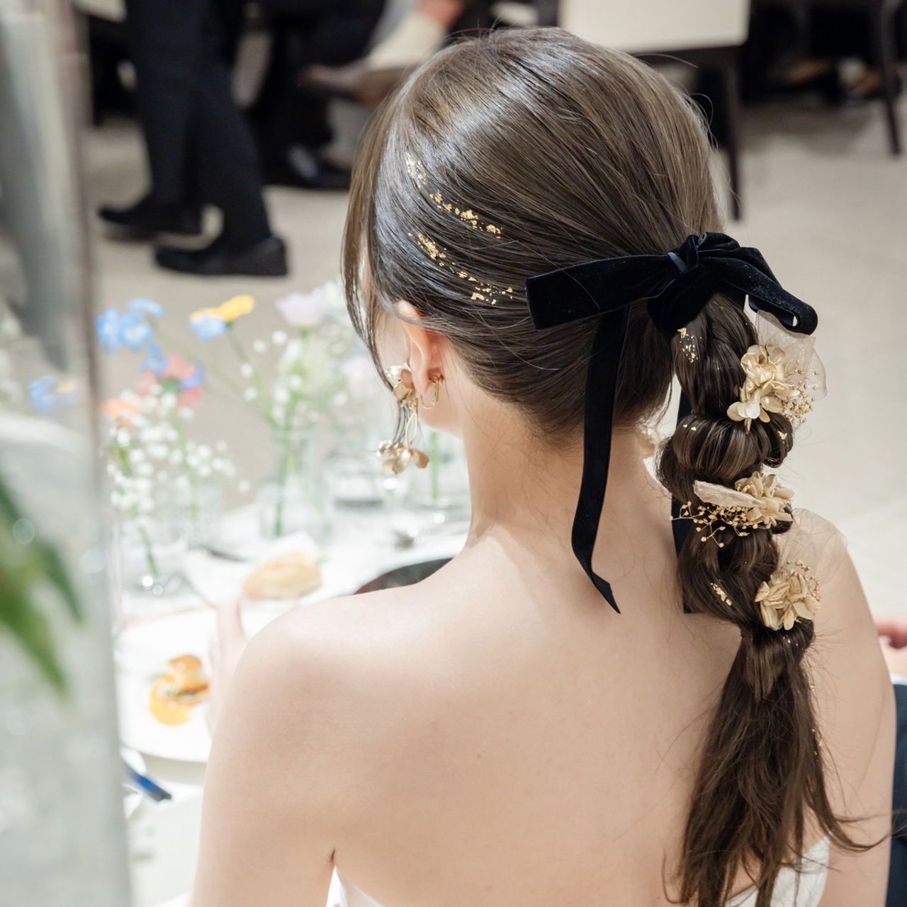 シンプルで上品なピンクと2着目のヘッドセットやアクセサリーのゴールドと合わせて、ゴールドの花びらを散りばめました。