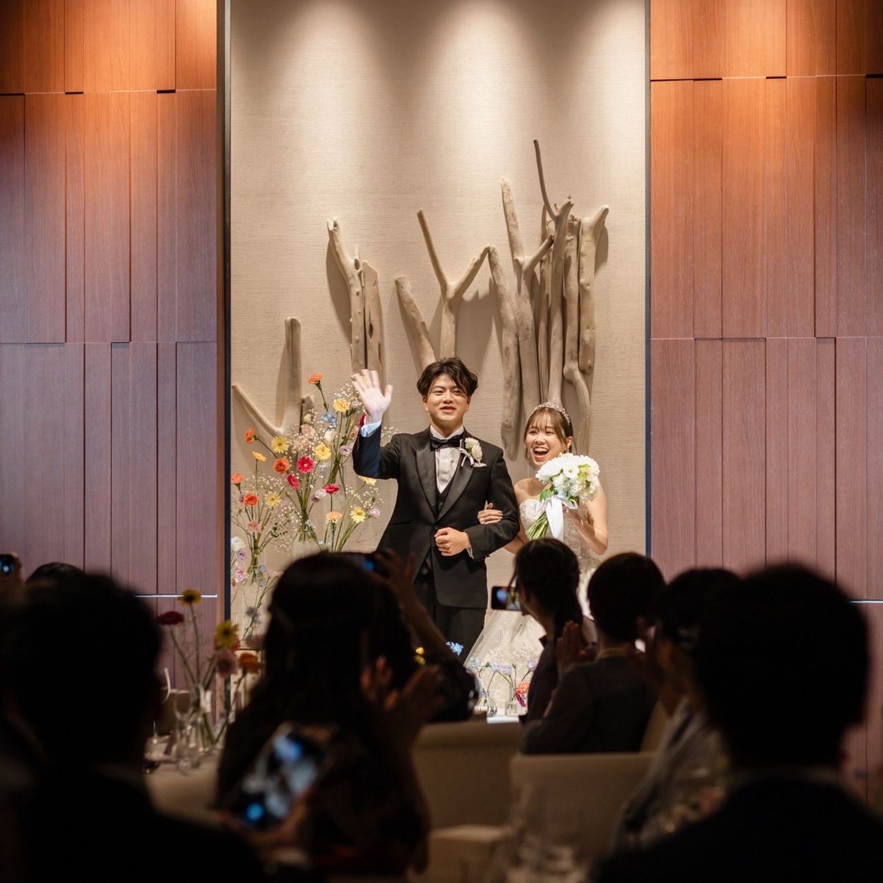 音楽とともにプロジェクションマッピングが流れ、壁のように見えていた扉が開いて新郎新婦が登場します。実際に驚いてくれた方がたくさんいました!