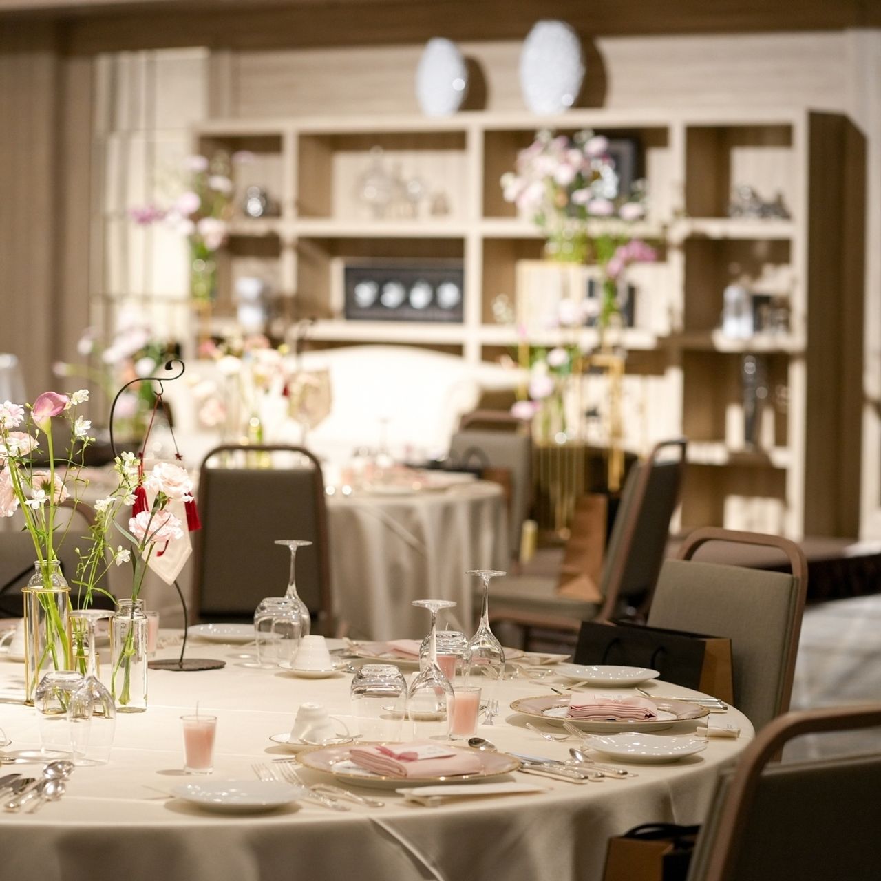 ホテルによっては絨毯などの主張が強い会場もあると思いますが、オリエンタル福岡 博多ステーションはシンプルなのでクロスやナフキンなどで凄くイメージが変わると思います。