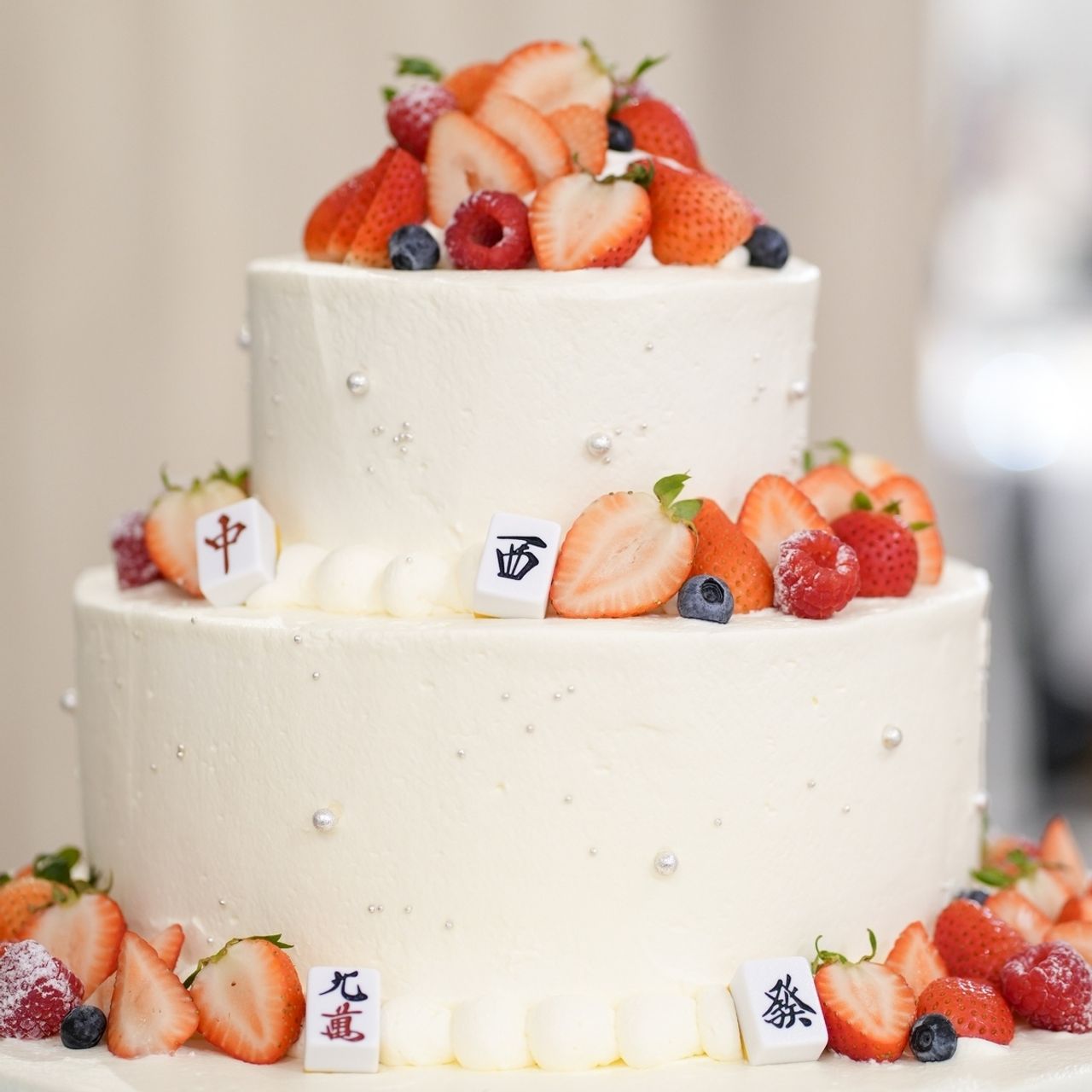 いちごを乗せたシンプルな3段ケーキに麻雀牌を散りばめてもらい、今まで見た事のないケーキに仕上げてもらいました。