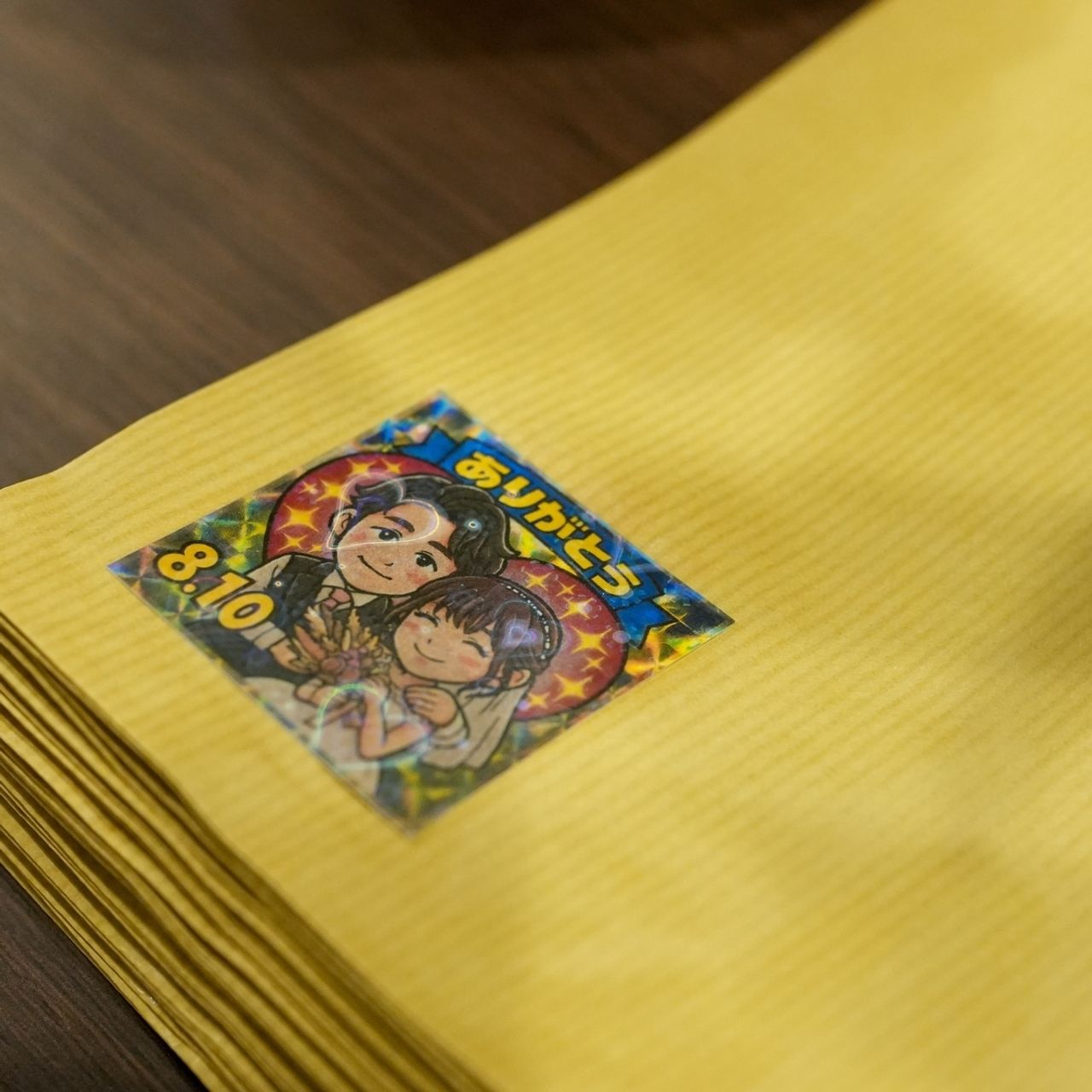 私たちをモチーフに作ったビックリマンチョコ風シールを貼ったオリジナルの駄菓子袋をお見送りの際に手渡ししています🤍