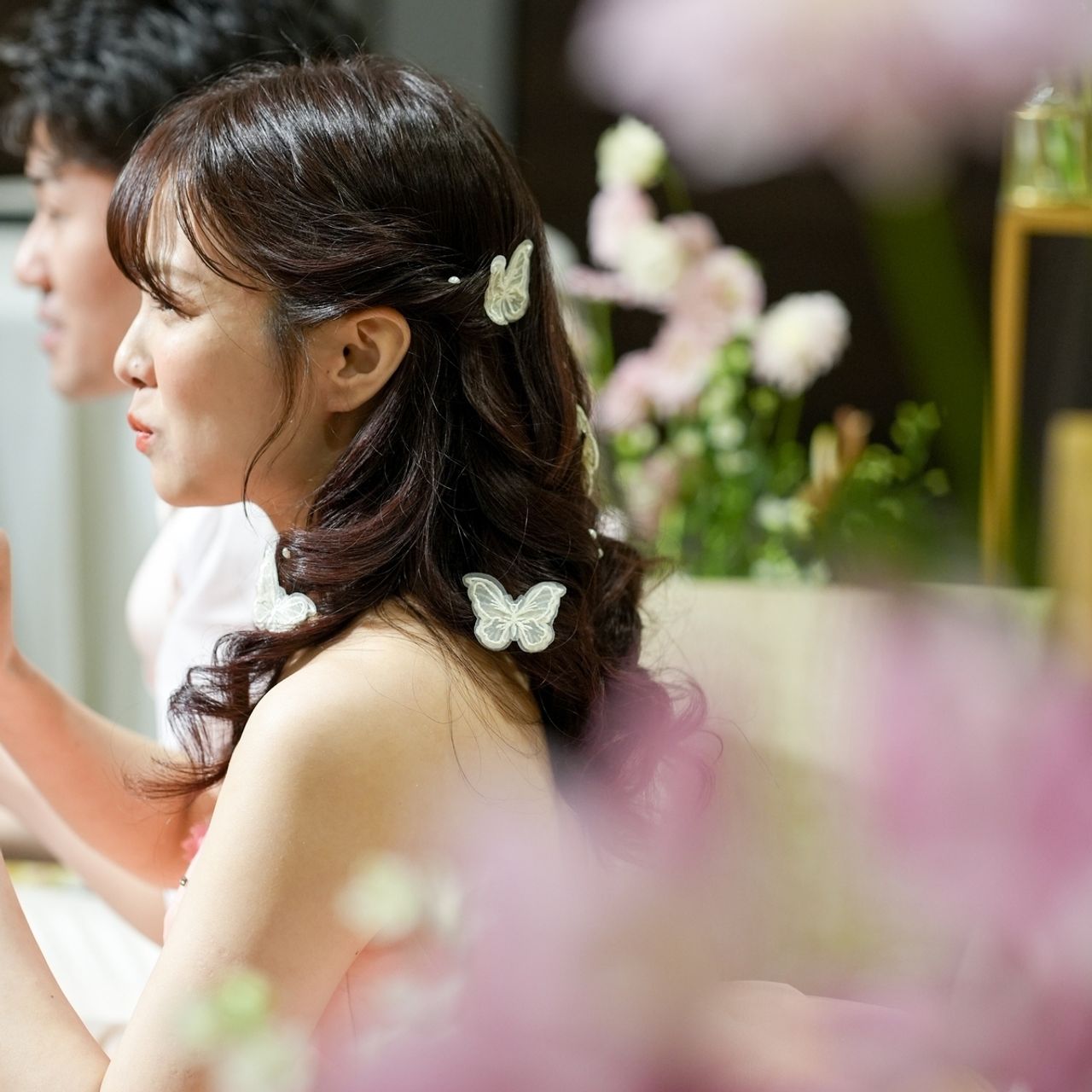 お色直し:ダウンスタイルにしてもらったため、バタフライヘアクリップを付けました。