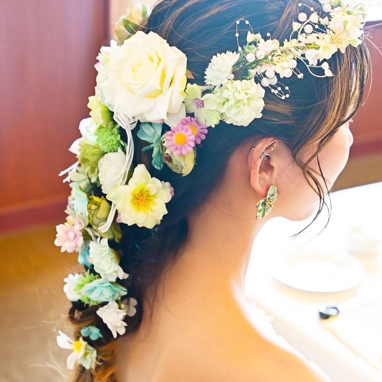 挙式ではティアラ、披露宴ではラプンツェルのようにお花をたくさん飾ってもらい、トップには花冠を乗せています。