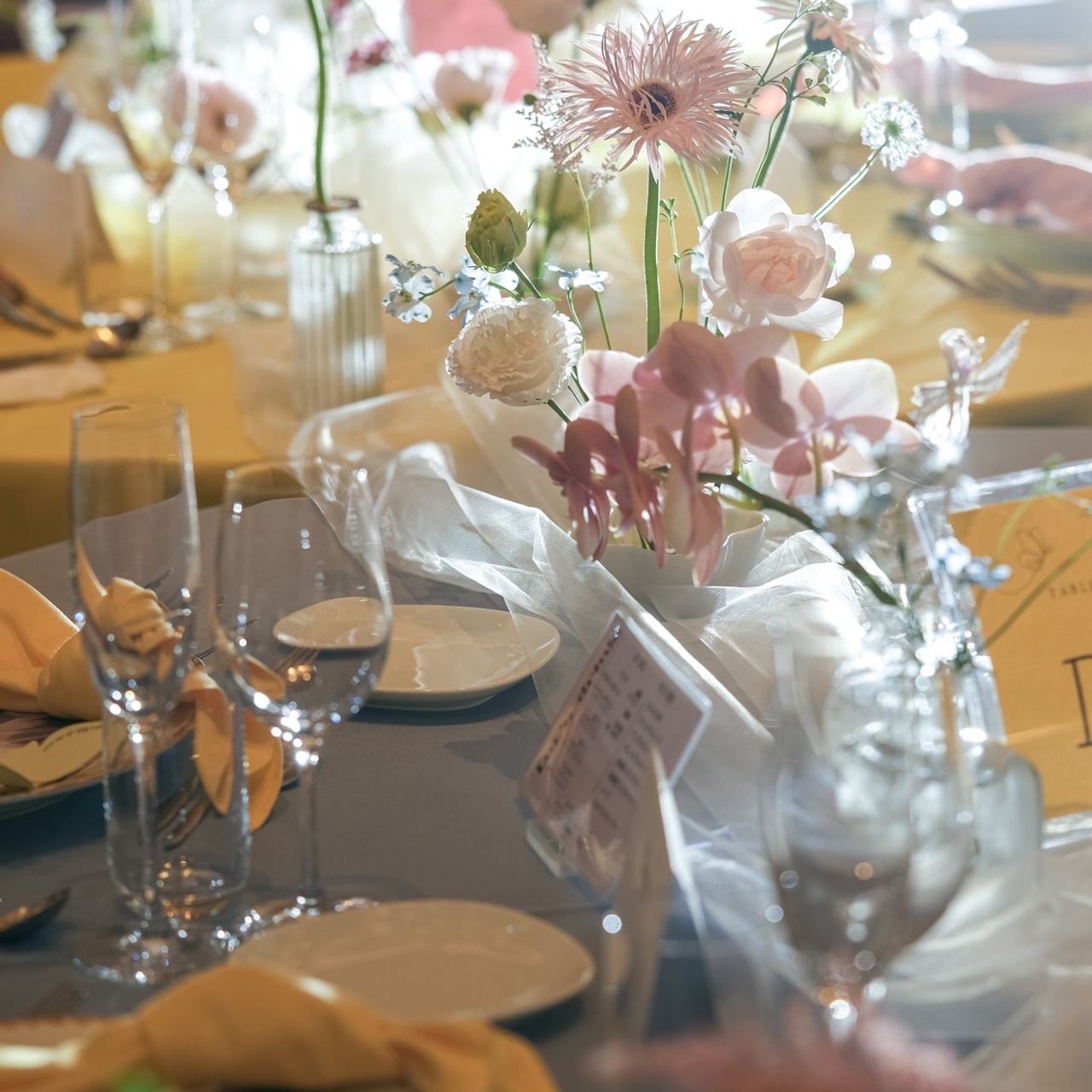 全体のモチーフには「愛と成長の象徴」といわれる蝶を取り入れ、装飾はもちろん、席札やエスコートカード、ヘアアクセサリーにも活用しました。