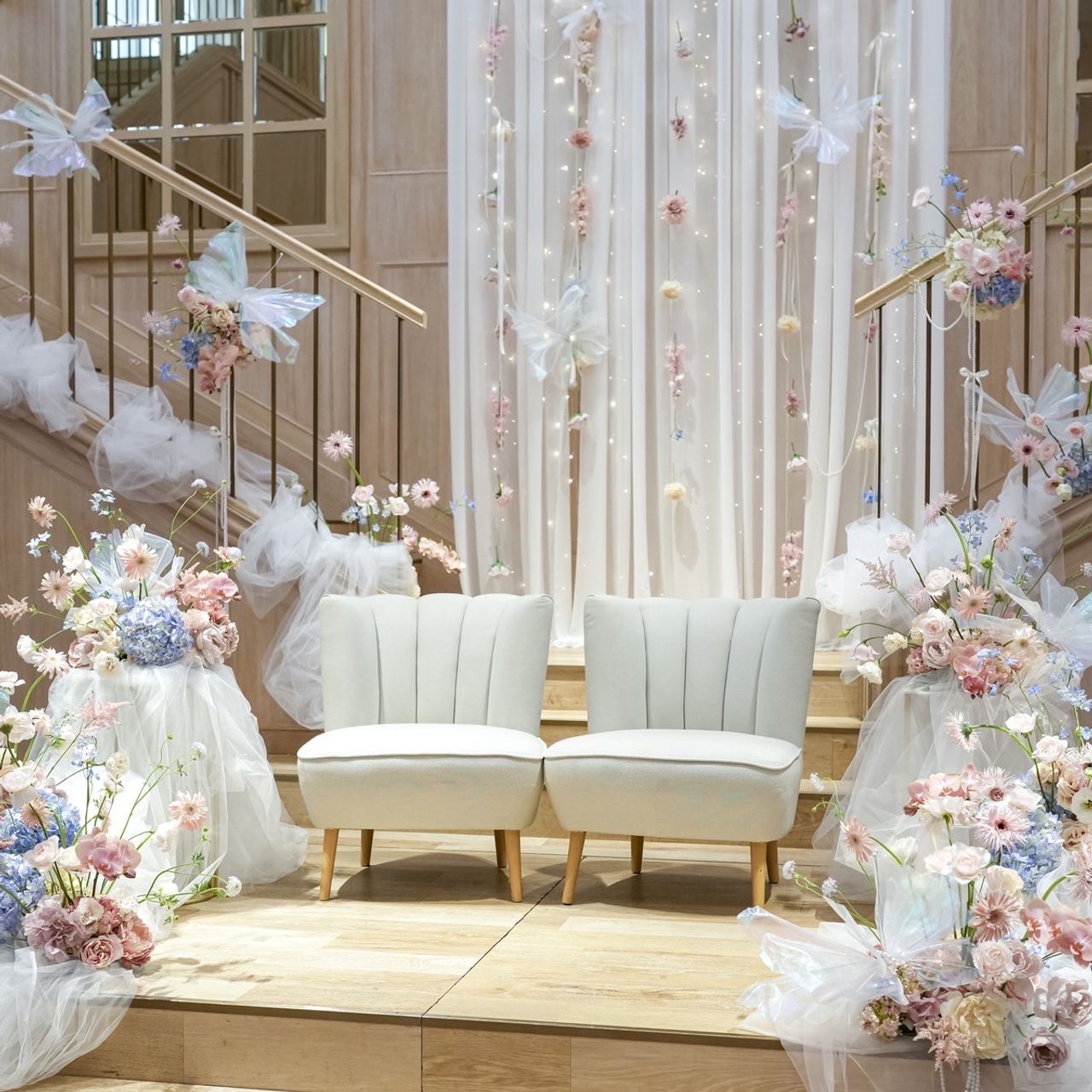 また、この会場を選んだ理由は、装花のクオリティがとても高かったことに加え、披露宴会場の高い天井や丸みのあるシャンデリア、正面に伸びる階段などのデザインを一目見て感動したからです。