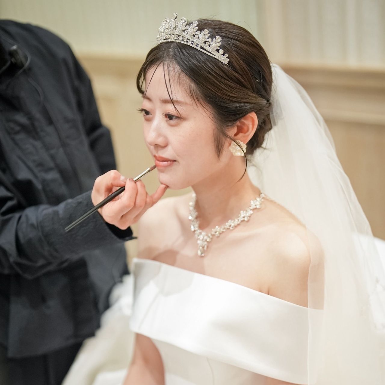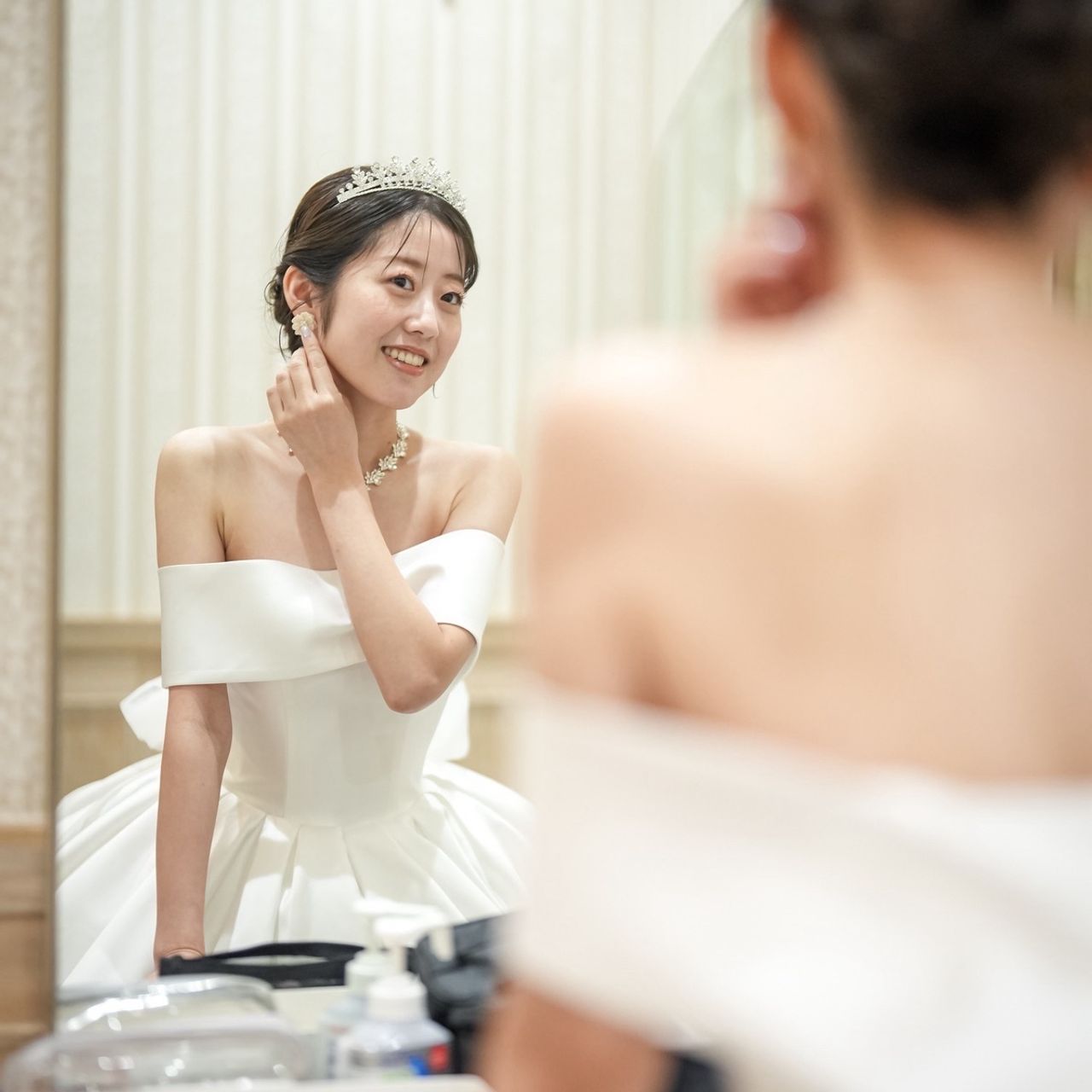 サテン生地の王道ウェディングドレスを探していましたが、提携ドレスショップでは気に入る一着に出会えず、別のショップでオーダーメイドのドレスを購入しました。挙式ではオフショルダー、披露宴ではビスチェとデザインを変えられたため、シーンごとに雰囲気の違いを楽しめたのがとても良かったです。