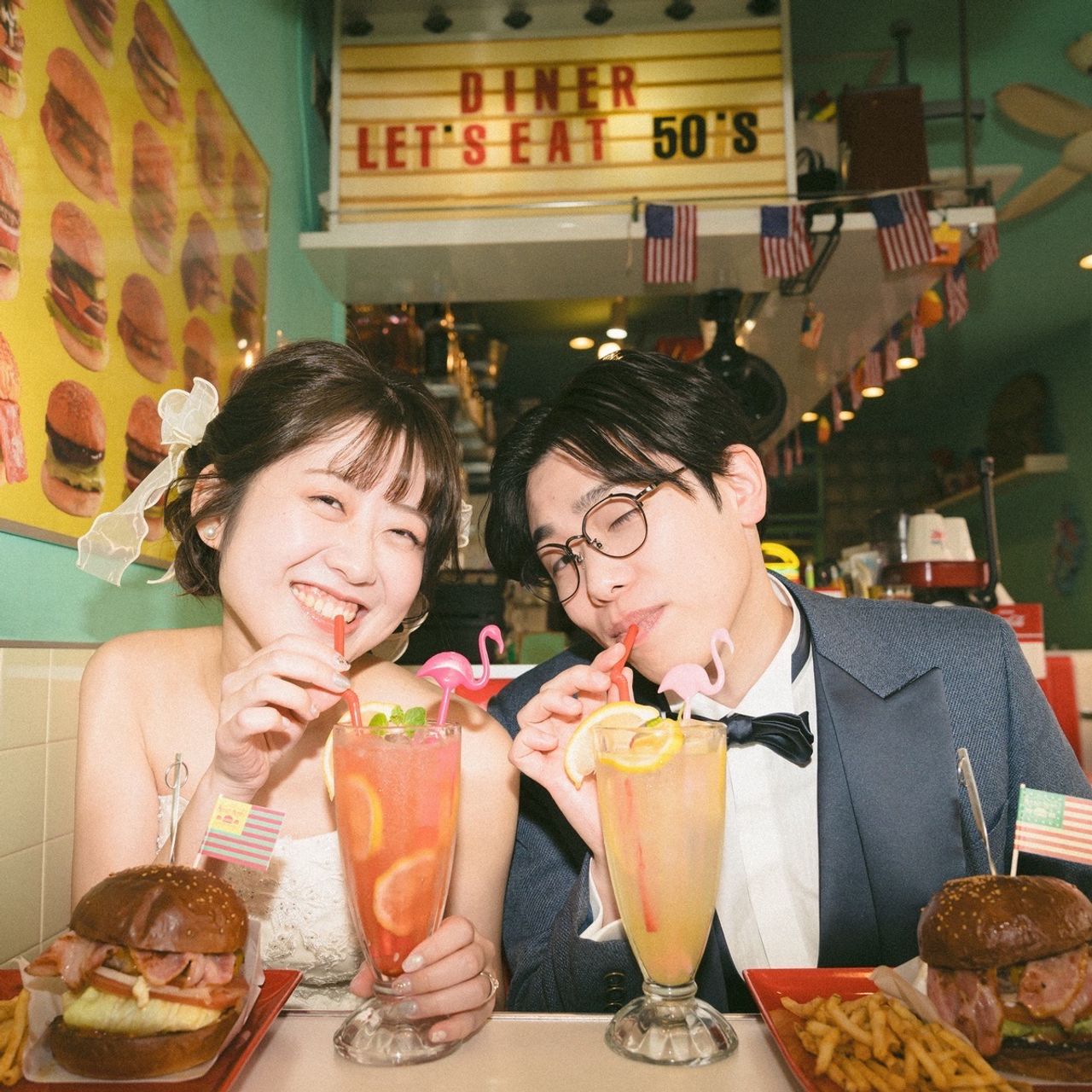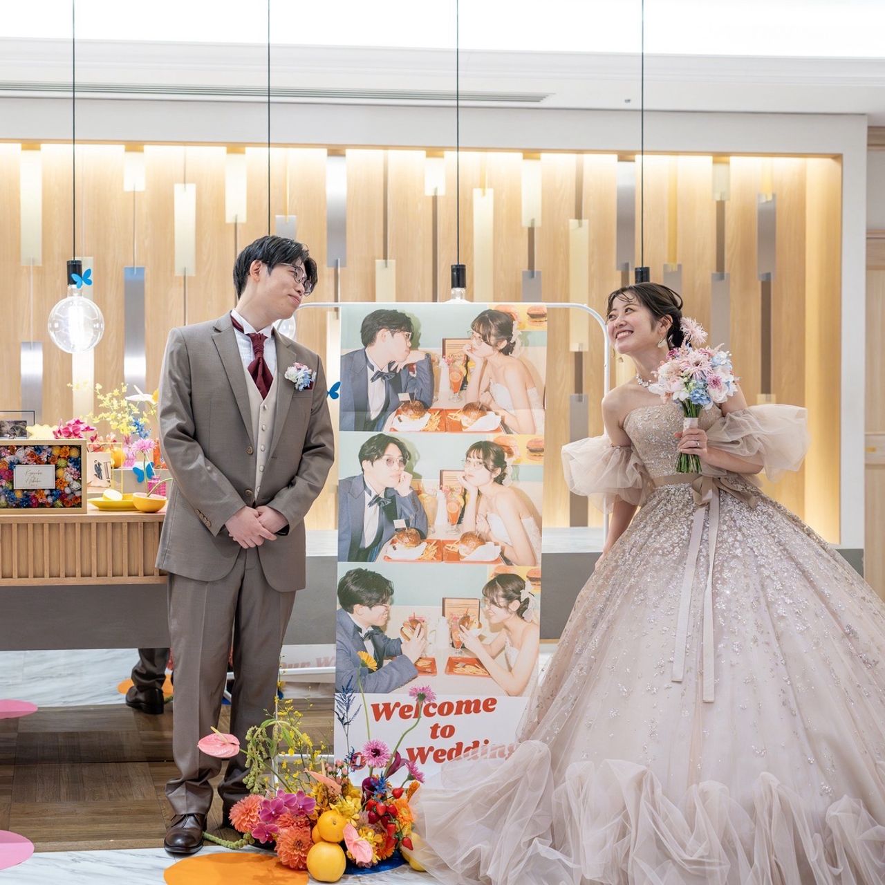 普段の私はビビッドカラーやポップなデザインが好きなこともあり、前撮りは街中でポップなテイストに撮影してもらったのですが、中でもダイナー風のカフェで撮影した写真が気に入り、その写真をウェルカムスペースのタペストリーに採用しています。その一枚に雰囲気を合わせたことで、カラフルでポップな空間に仕上がり大満足です。