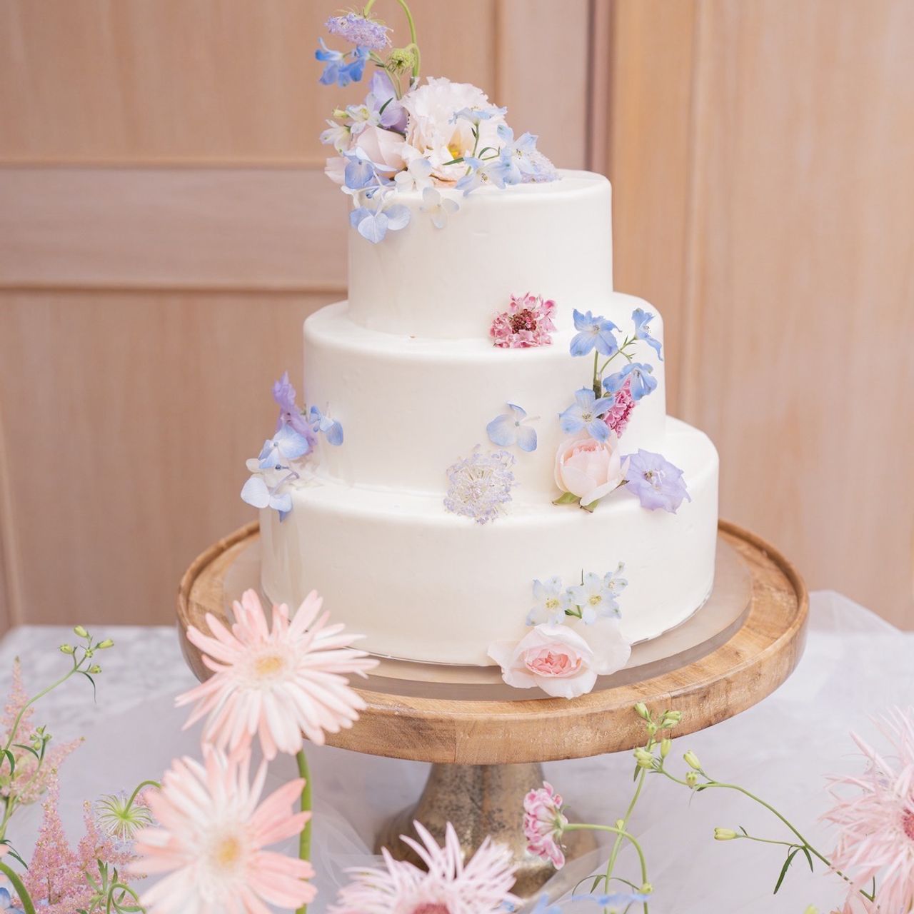 真っ白の3段ケーキです。ケーキにもお花を飾りたかったため、式場の装飾に合わせてあしらってもらいました。