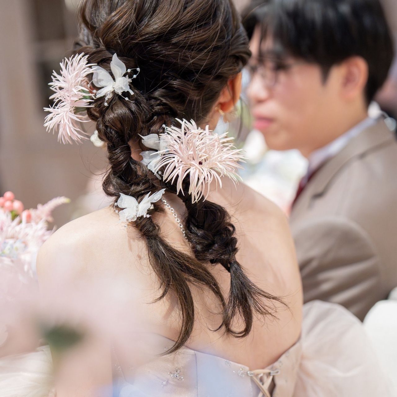 挙式ではティアラとベールを合わせ、披露宴ではベールを外してサイドにパールをあしらいました。カラードレスのときは編みおろしツインヘアにし、蝶々とガーベラの生花をつけています。