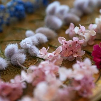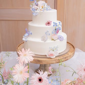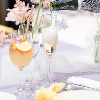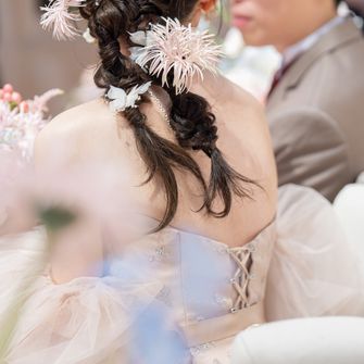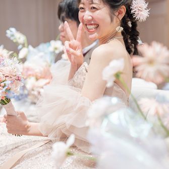 披露宴会場は、一目惚れしたカラードレスに合わせて全体の世界観を作り込んでいます。ドレスはチュールとラメがきらめく華やかなベージュピンクで、そのイメージに合わせて装花も可愛らしい雰囲気にまとめました。