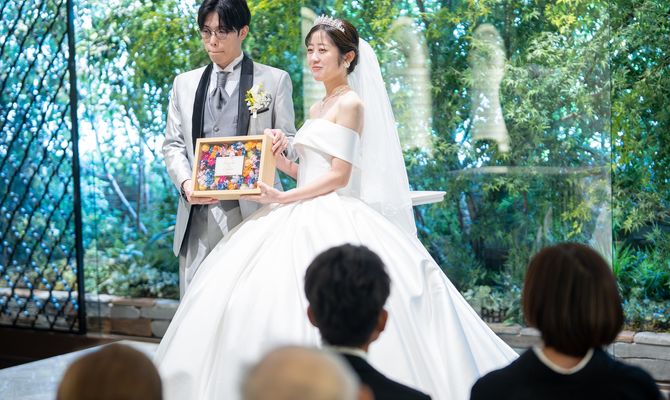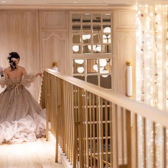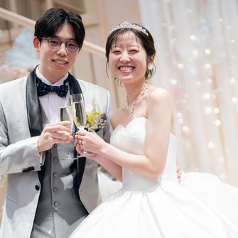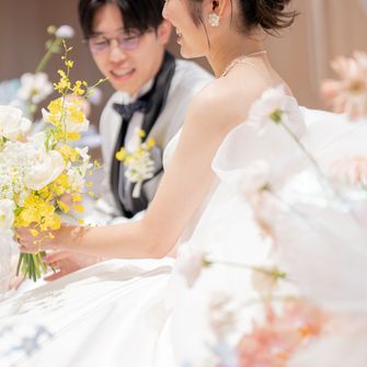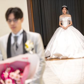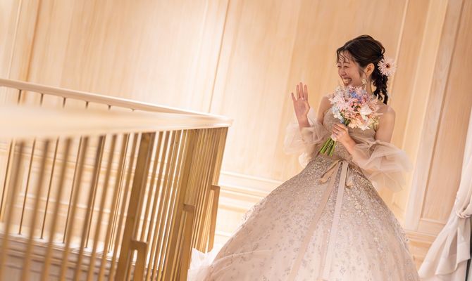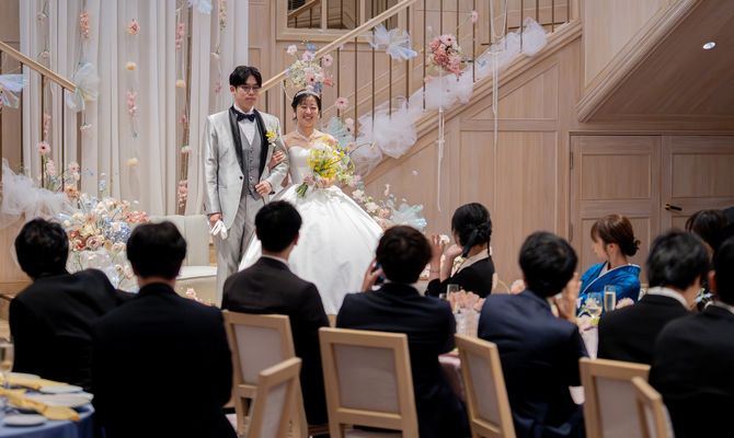 また、この会場を選んだ理由は、装花のクオリティがとても高かったことに加え、披露宴会場の高い天井や丸みのあるシャンデリア、正面に伸びる階段などのデザインを一目見て感動したからです。
