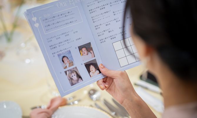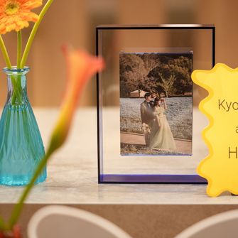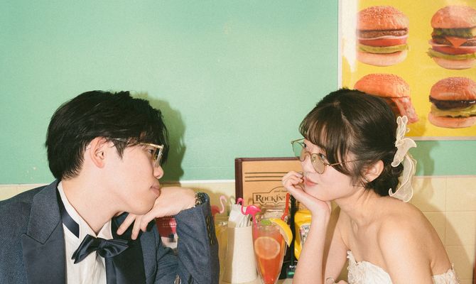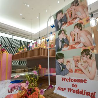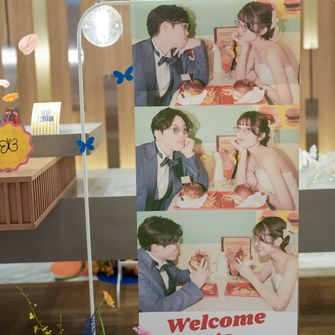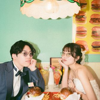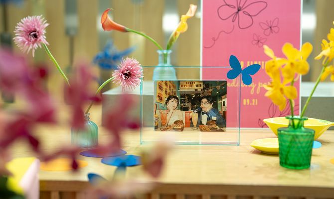 普段の私はビビッドカラーやポップなデザインが好きなこともあり、前撮りは街中でポップなテイストに撮影してもらったのですが、中でもダイナー風のカフェで撮影した写真が気に入り、その写真をウェルカムスペースのタペストリーに採用しています。その一枚に雰囲気を合わせたことで、カラフルでポップな空間に仕上がり大満足です。