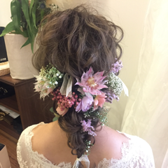 ヘアーは挙式は波ウェーブ、シニヨンに 小枝アクセサリー 披露宴は編みおろしに生花をさしました。