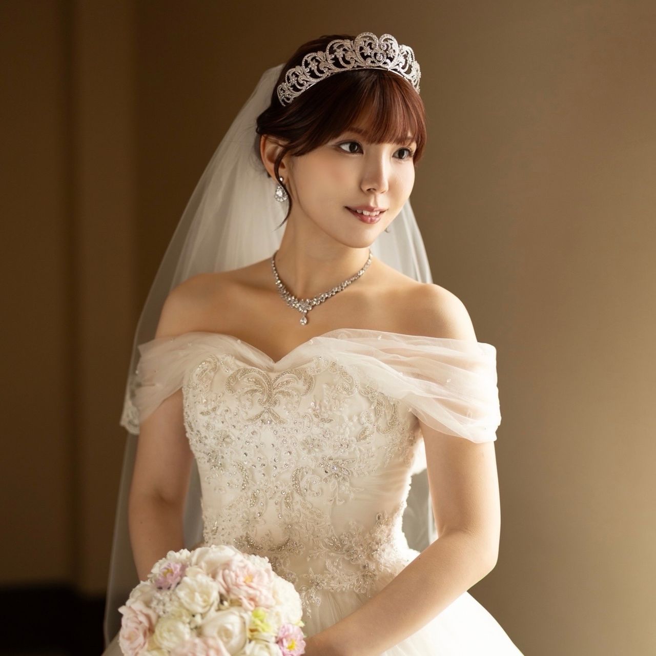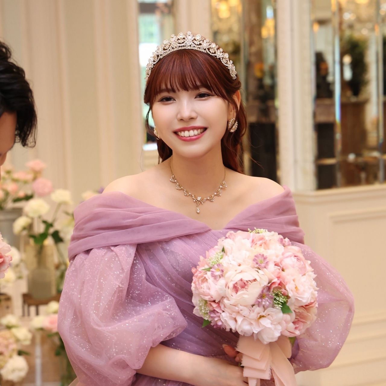 ⧉ ロールカラーケープのドレスに合わせてネックレスをあえて着用せず、ティアラとパールピアスで上品にまとめました🫧