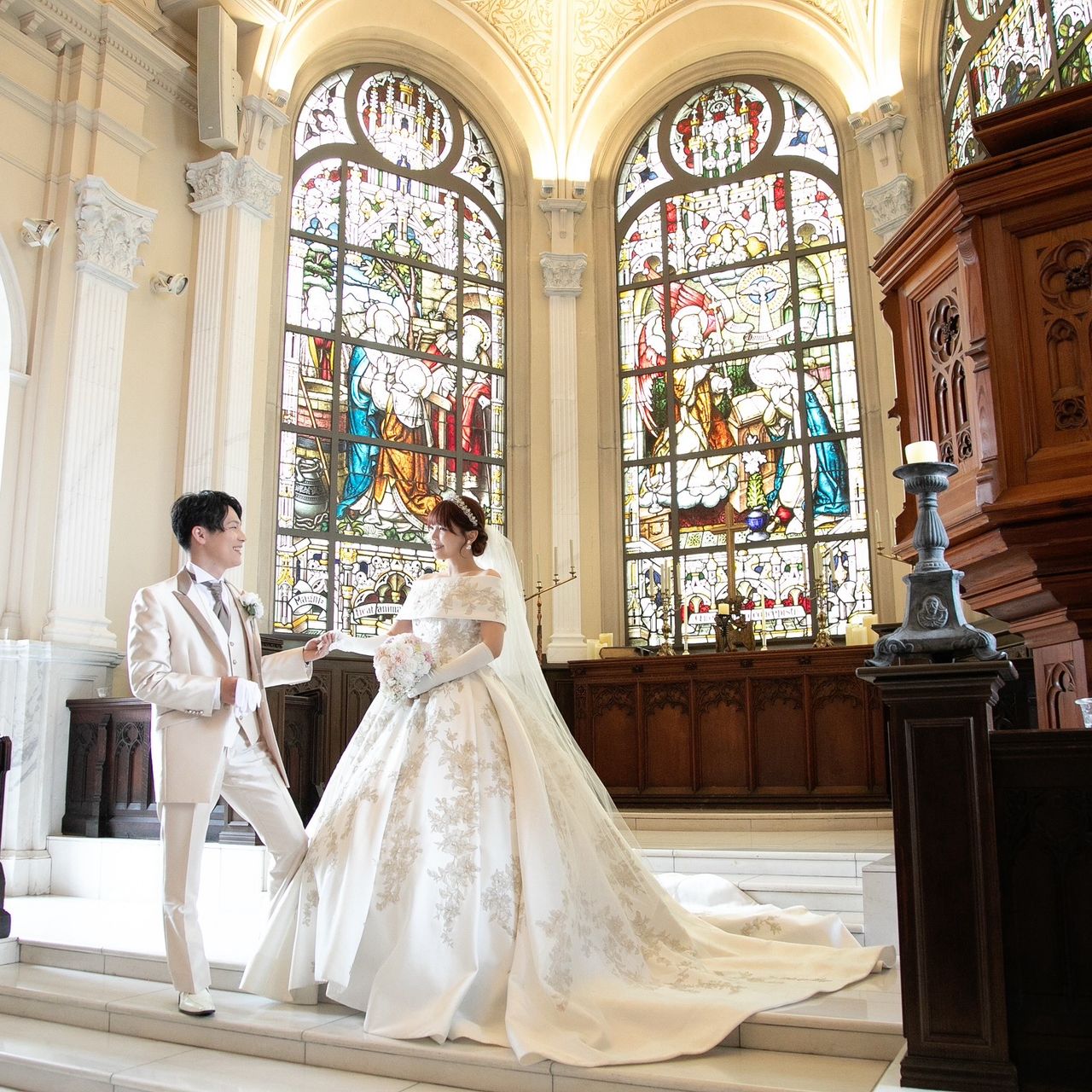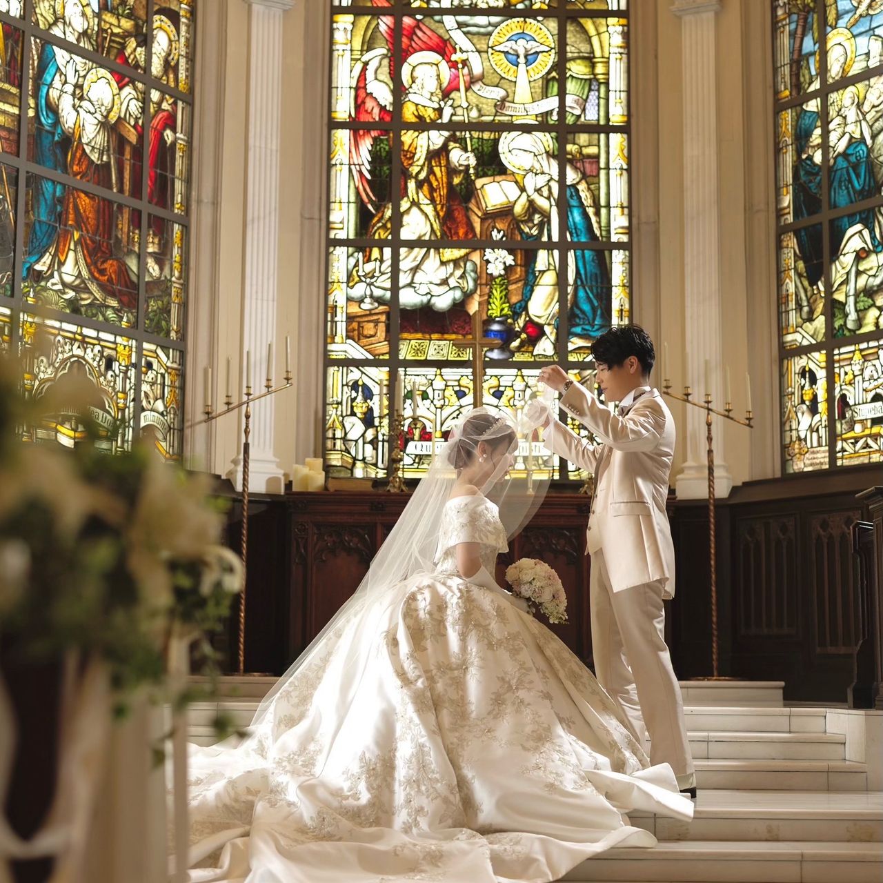 挙式を行うサンタムール大聖堂の美しいステンドグラスに見劣りしないロイヤル感に一目惚れしました💗