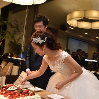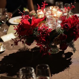 そんなパーティシーズンのひとときをゲストにも楽しんでもらいたく、披露宴は赤とゴールド、キャンドルを基調に装花や小物を考え、華やかさも演出しました。