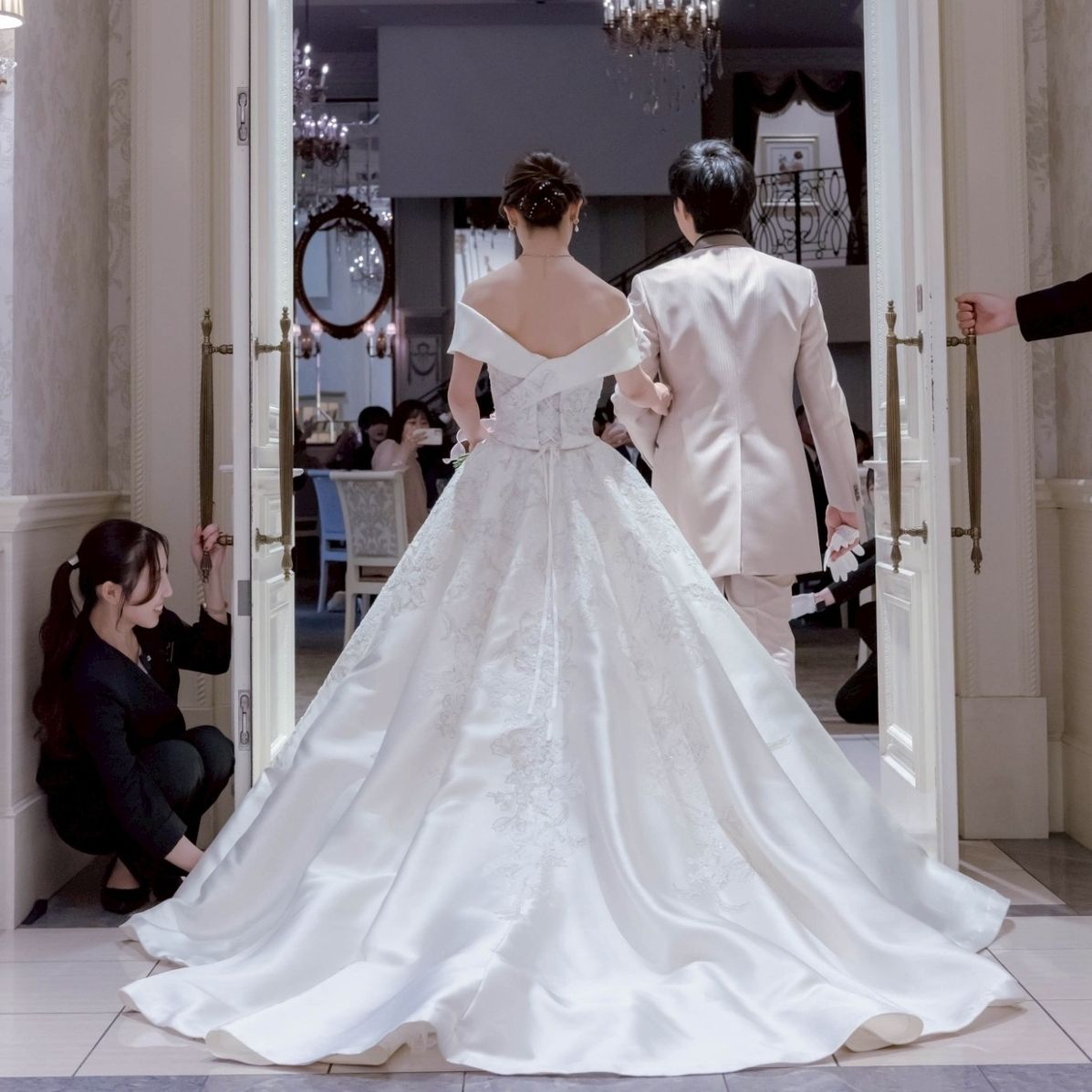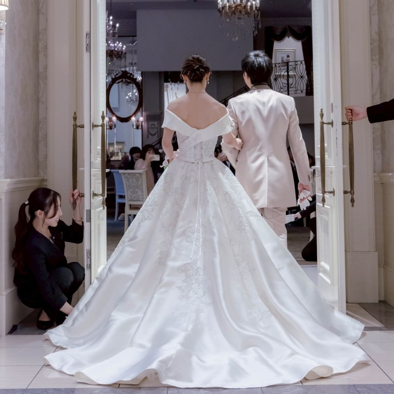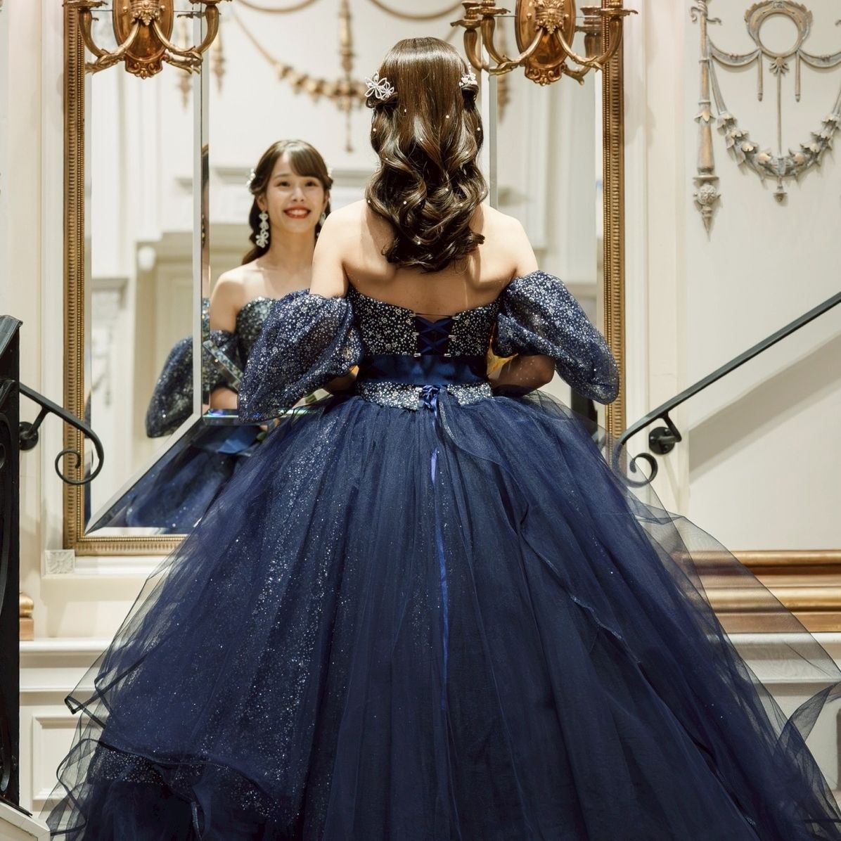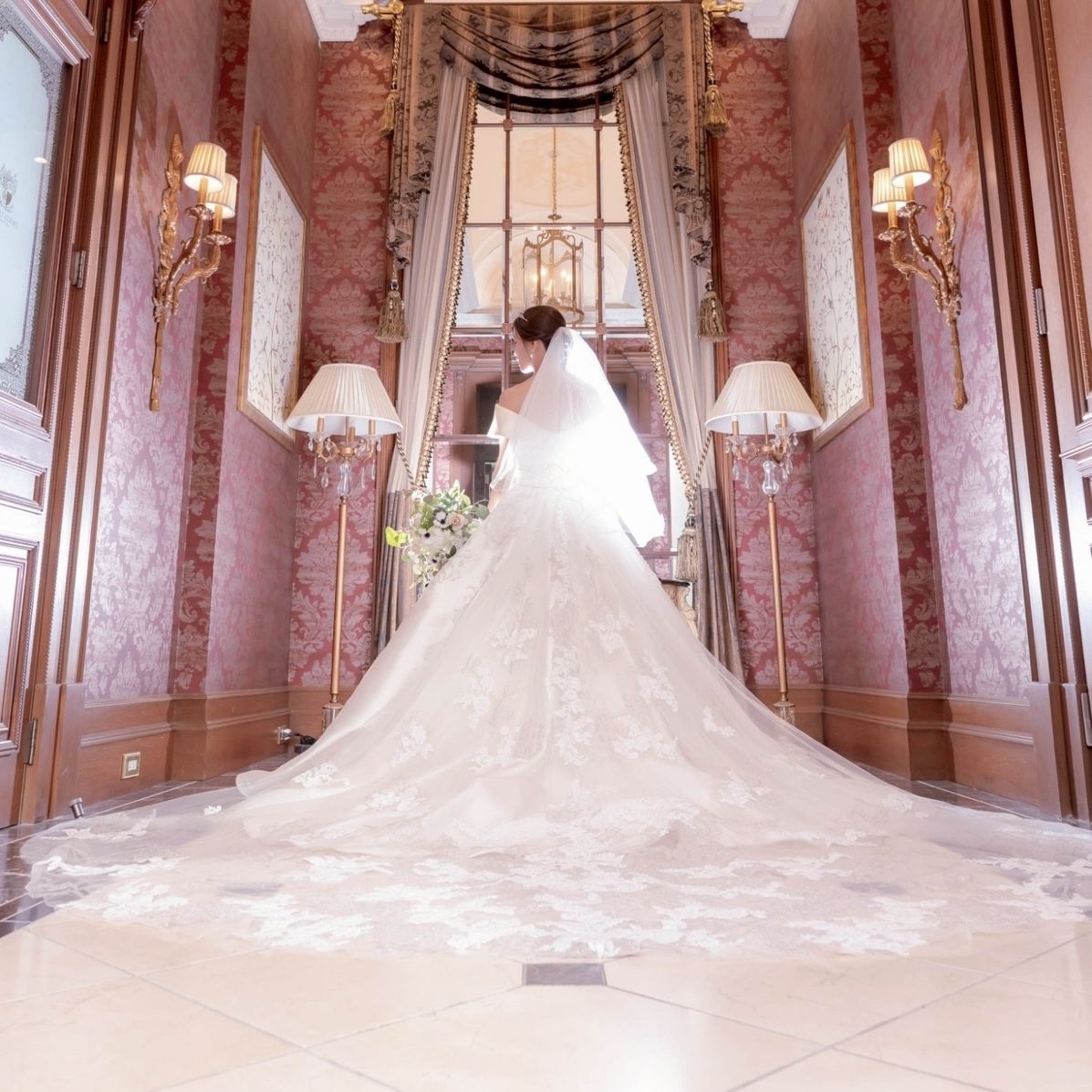 式場の前撮りで大階段に映えるロングトレーンはドレス探しで譲れない条件でした。