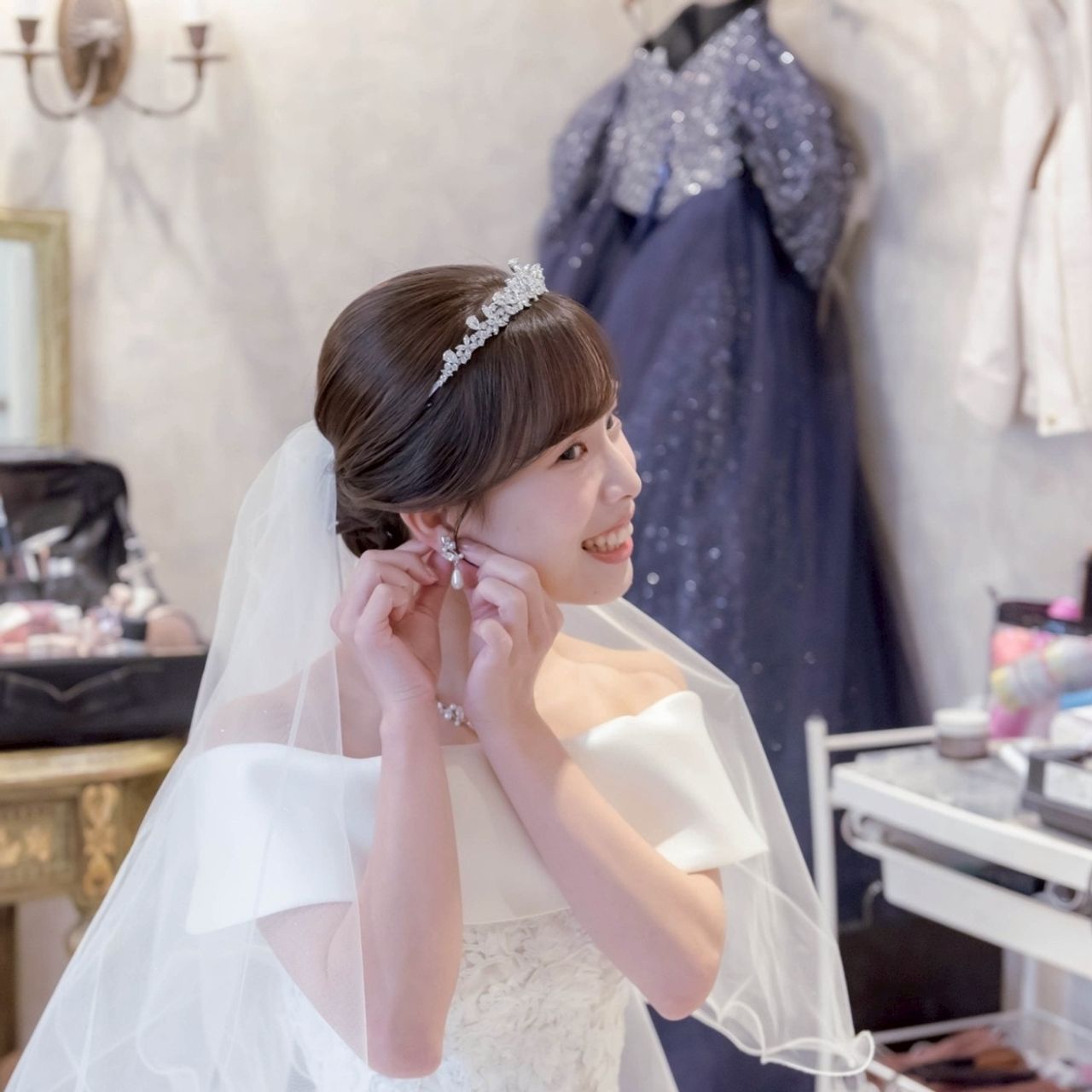ウェディングドレスはドレスショップでレンタルしたティアラを着用しています。