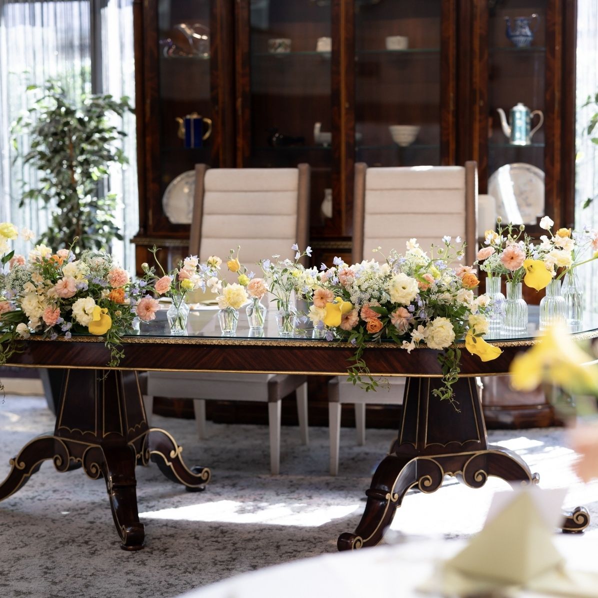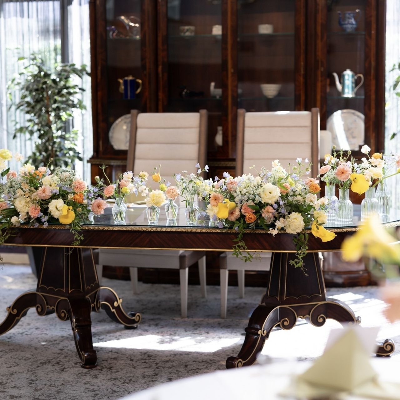 イメージカラーや好きな花・苦手な花をお伝えし、春の気配を感じるようなパステルカラーの軽やかな装花にしたのがポイントです。