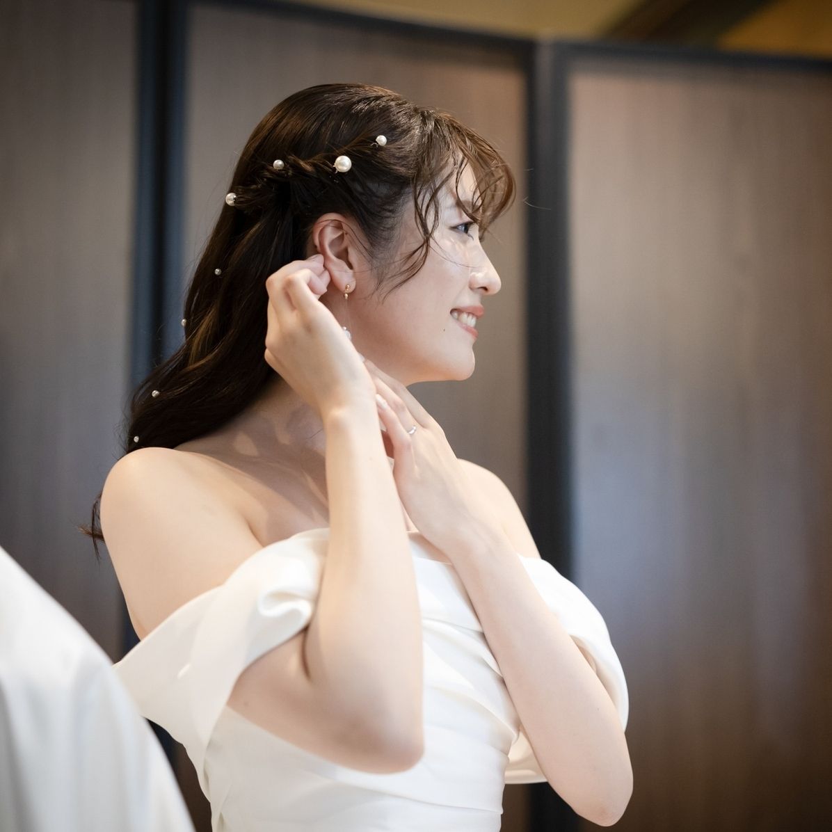ドレスがオフショルダーだったので、鎖骨にさりげなくパールシールを散りばめたのがお気に入りポイントです!