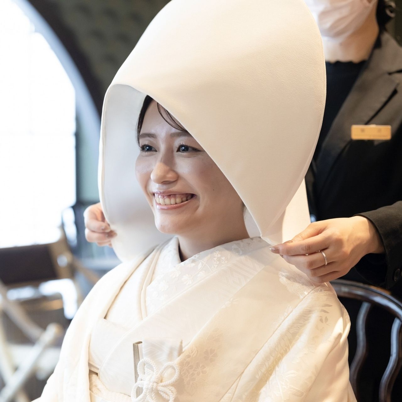 挙式は綿帽子で見えないので、披露宴で綿帽子を外すだけで、髪型を変えなくてもガラリと印象が変わる点を活かしています!
