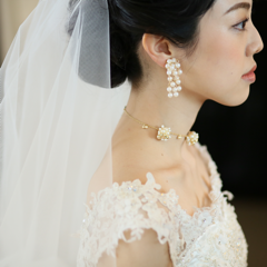 挙式では、コンパクトなシニヨンでまとめ髪と、