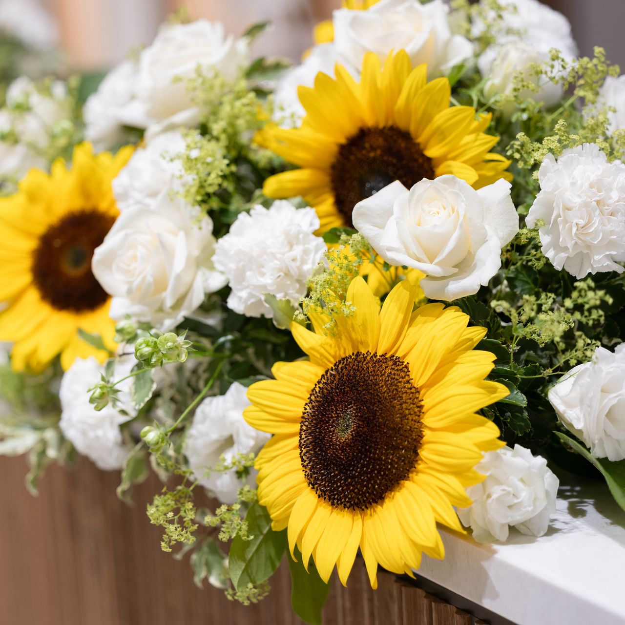 夏婚かつ、ひまわりが大好きなので夏全開のイメージにしました!クロスもTiffanyブルーで全体的に爽やかになるような配色です。