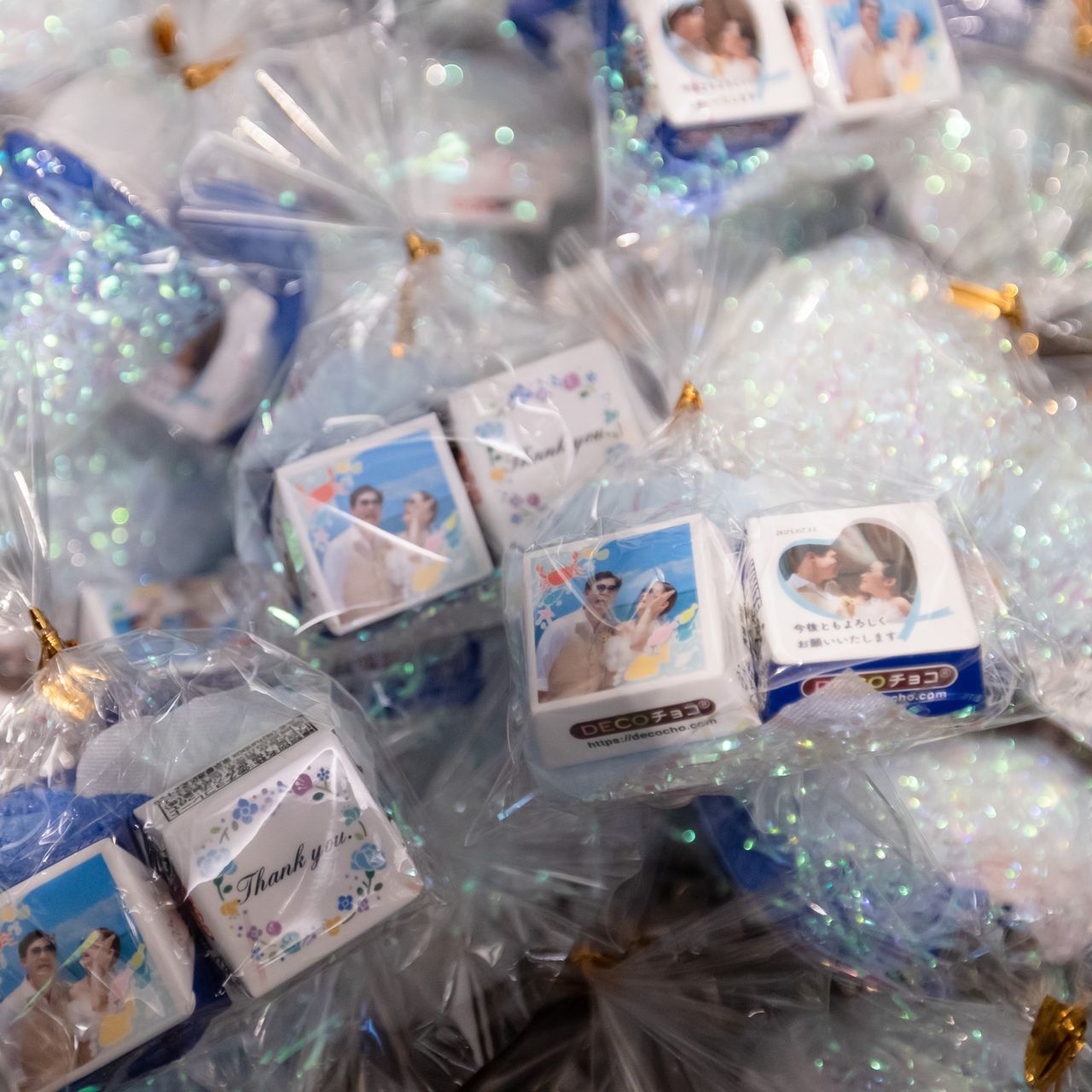 フラワーシャワーの花びらとラメの包装材を入れ、ひとつずつ想いを込めて作成しました。