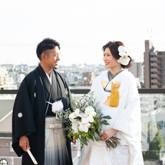 前撮りでも白無垢を着たのですが、もともと和装が好きで当日も着たいと思うほど気に入ってしまったので、前撮りの時とは小物や髪型、ブーケで雰囲気を変えて前撮りと同じ白無垢を着ました。ゲストには白無垢を着ることを内緒にしていたのですごく驚いていました。