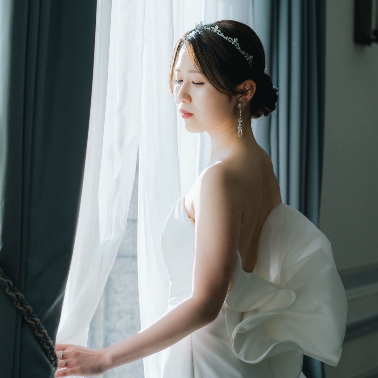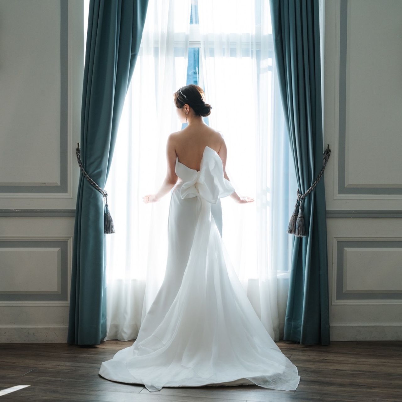 「絶対にこのウェディングドレスを着たい」と思い、即決でした!普通のウェディングドレスと違って、マーメイドの形で後ろに大きな飾りがあり、個性が出てよかったと思っています。