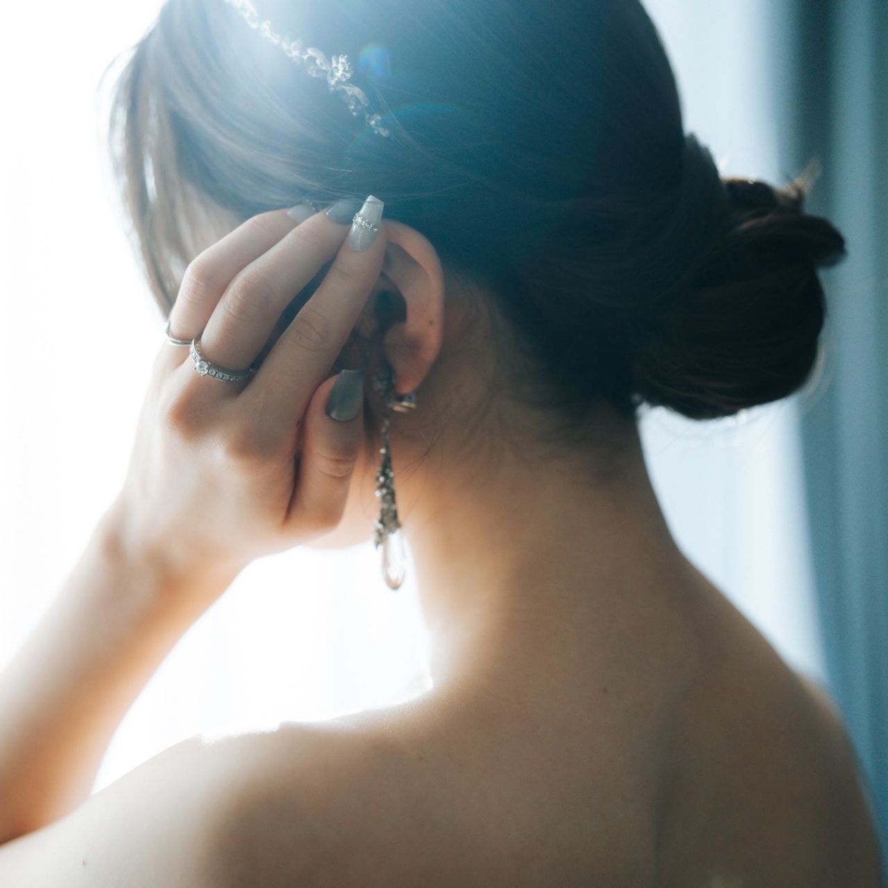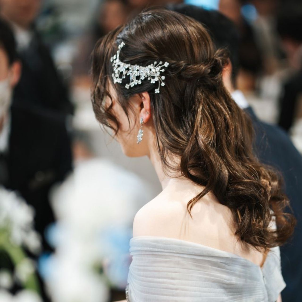 ウェディングドレスではティアラを選択し、2着目では頭の片側に花をちりばめたようなヘアアクセサリーを選びました。イヤリングとセットのようなものを選び、統一感を出しています。