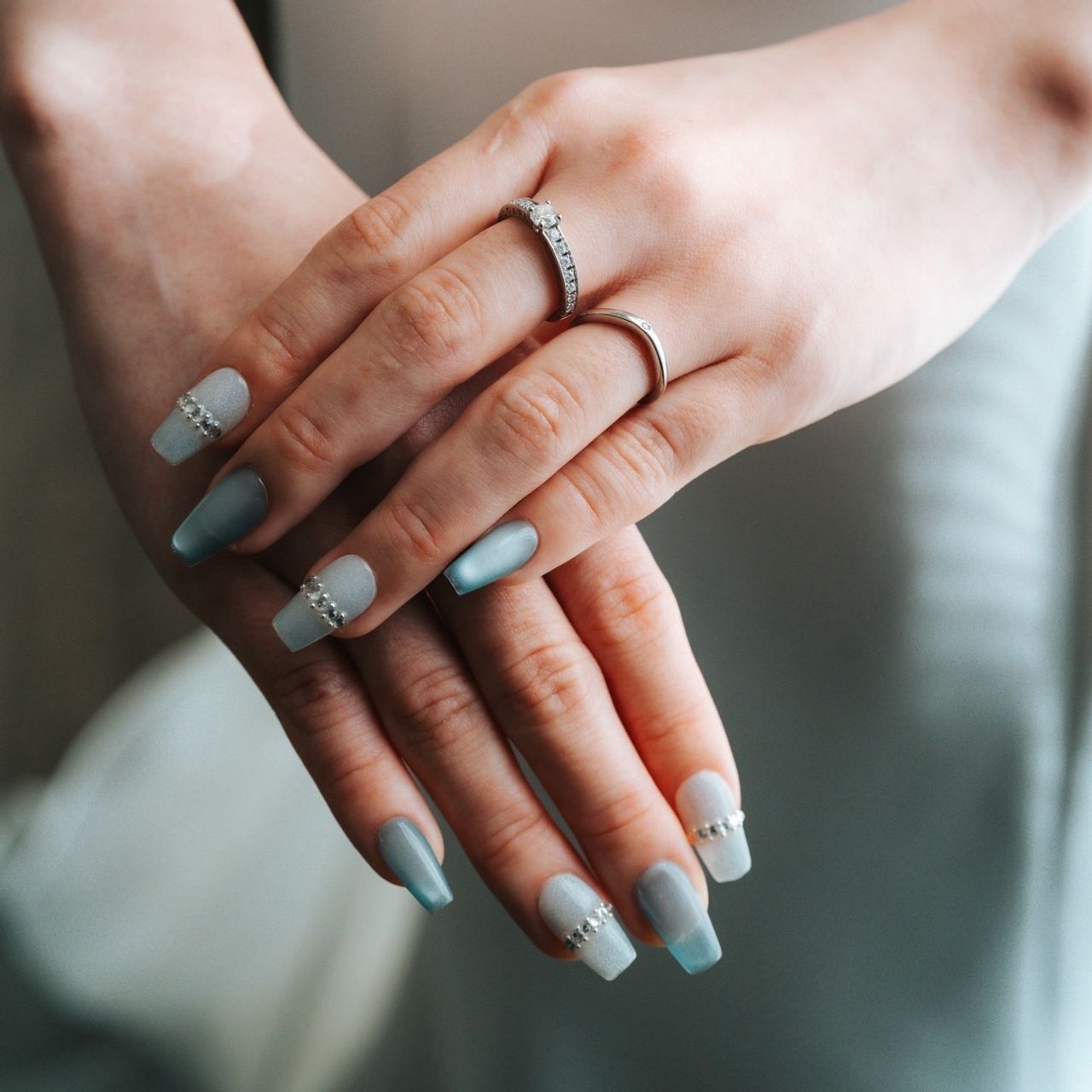 シルバーと青の色で統一したネイルです。