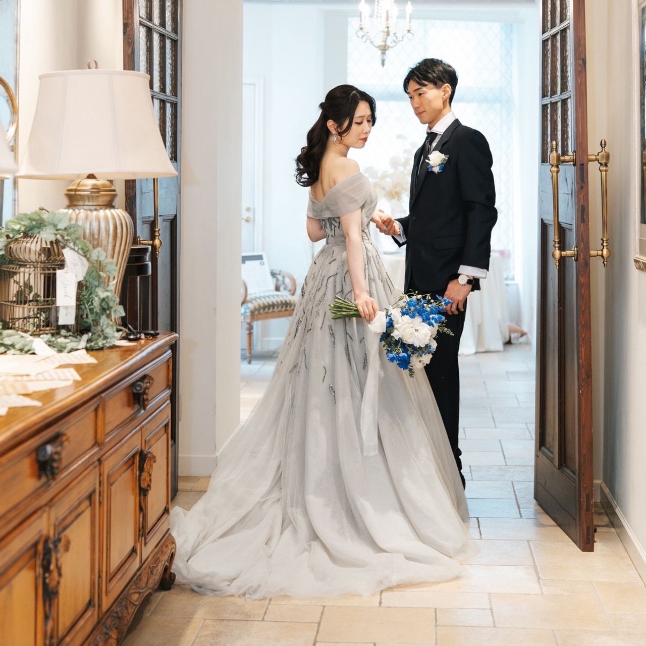 2人とも青と白が好きなので、テーマカラーを青と白にし、色を統一しています。